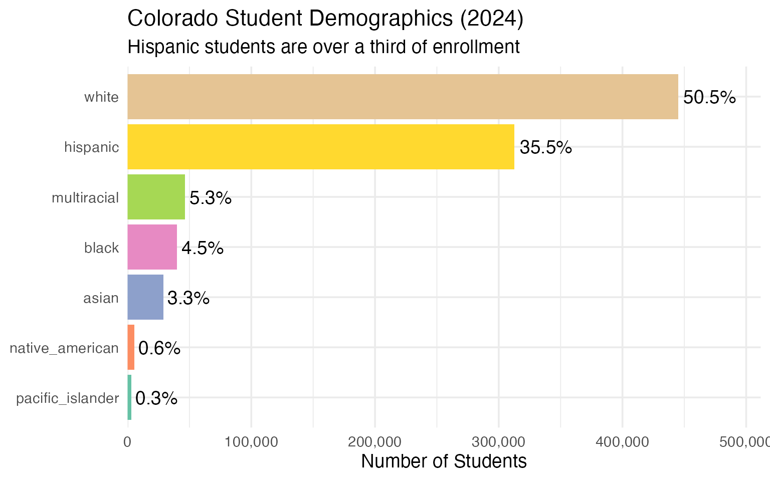 }This vignette explores Colorado’s public school enrollment data, surfacing key trends and demographic patterns. Colorado is part of the state schooldata project, a family of R packages providing consistent access to school enrollment data from all 50 states.
