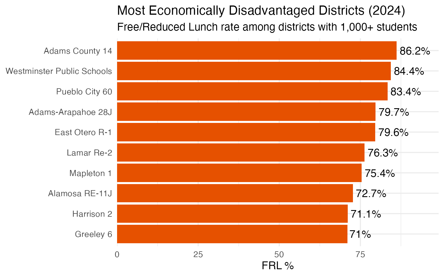 Adams County 14, in the northern Denver metro area, has the highest free/reduced lunch rate among districts with 1,000+ students.
