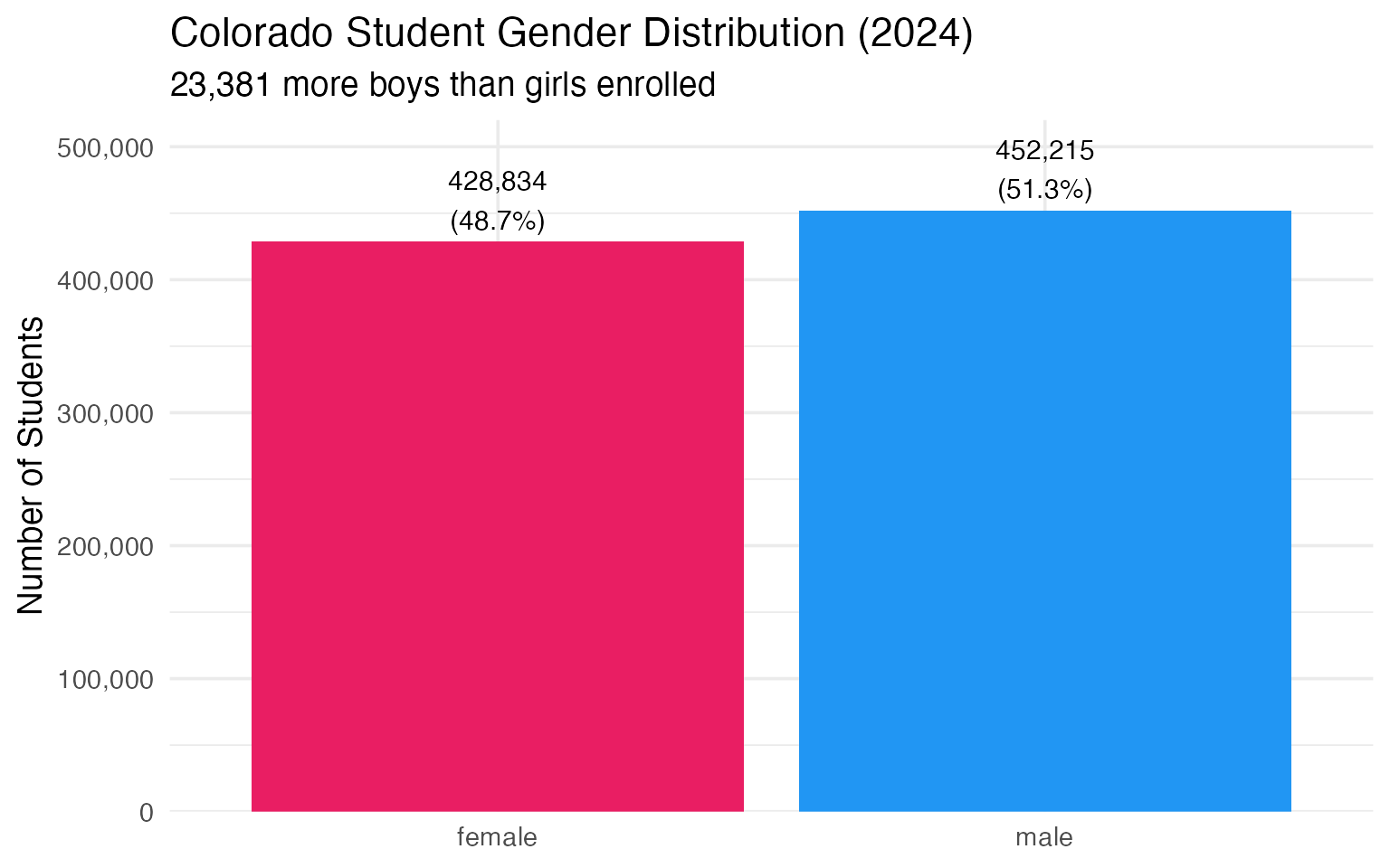 Like most states, Colorado enrolls slightly more boys than girls – a gap of about 23,000 students.