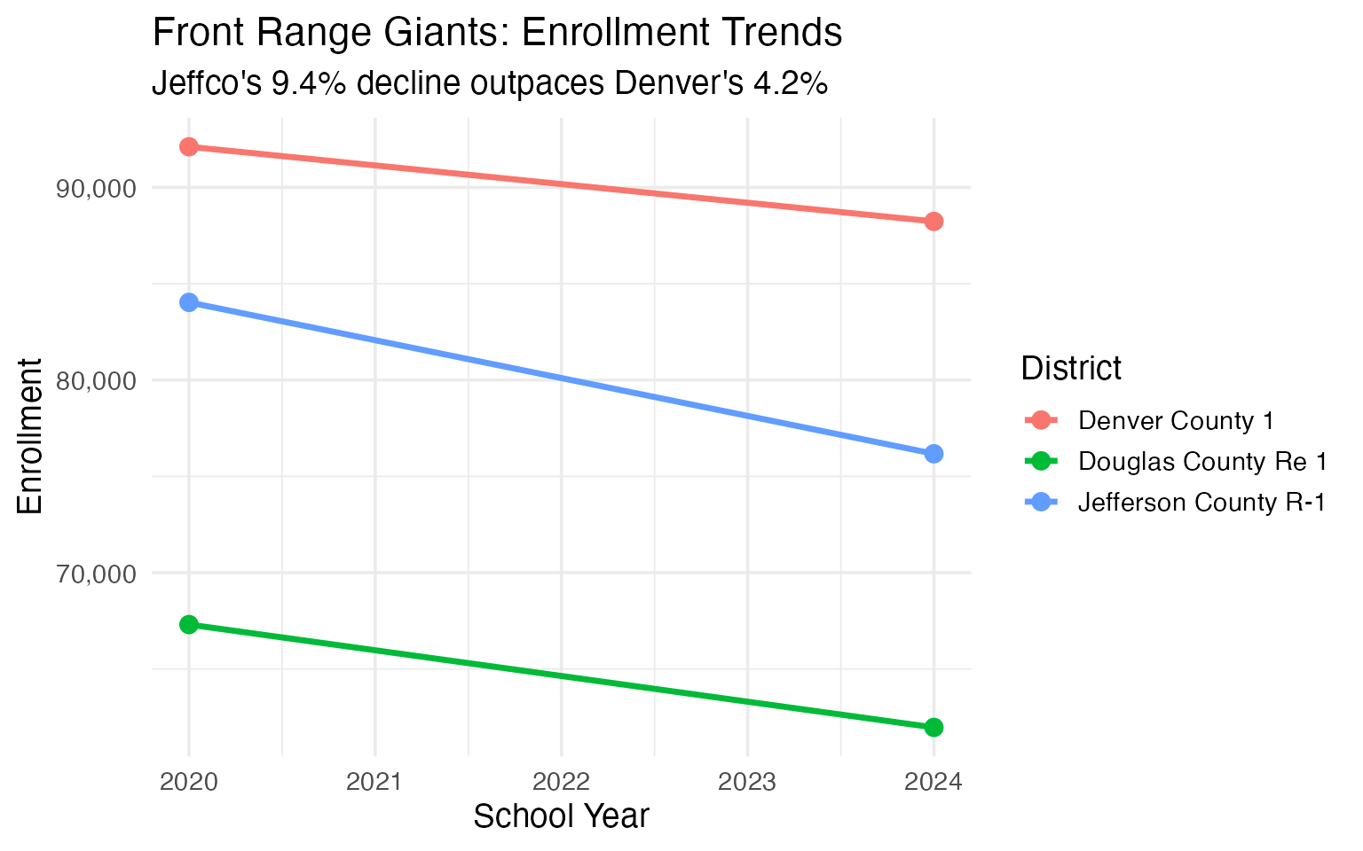 - Urban decline: Denver, Jeffco, and all but one top-10 district losing students