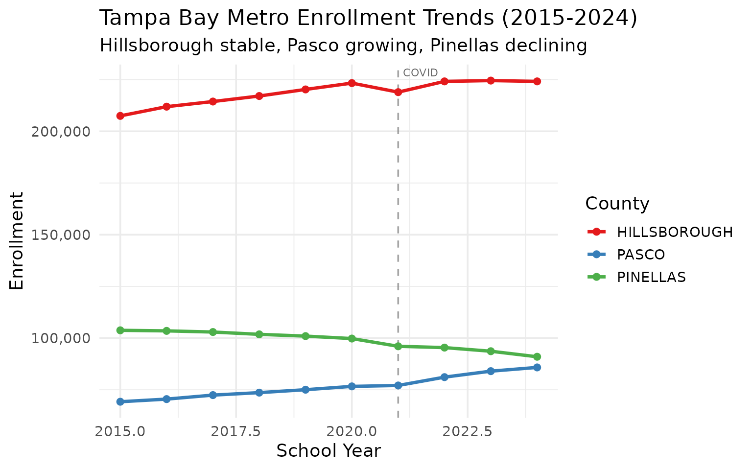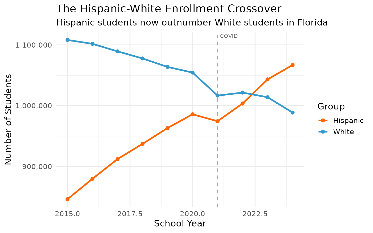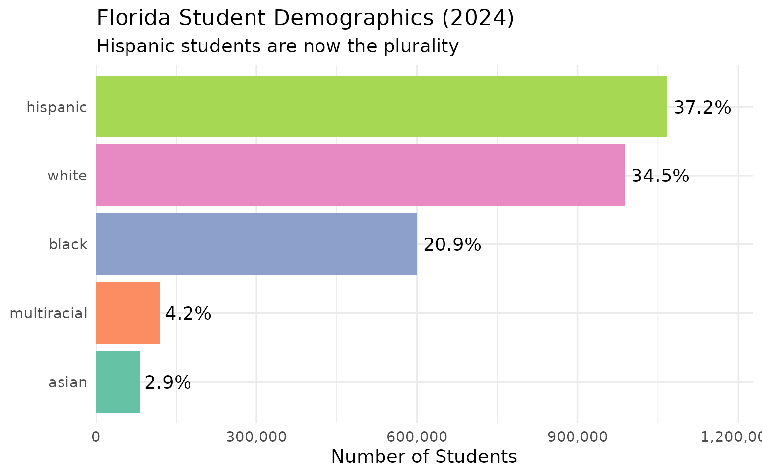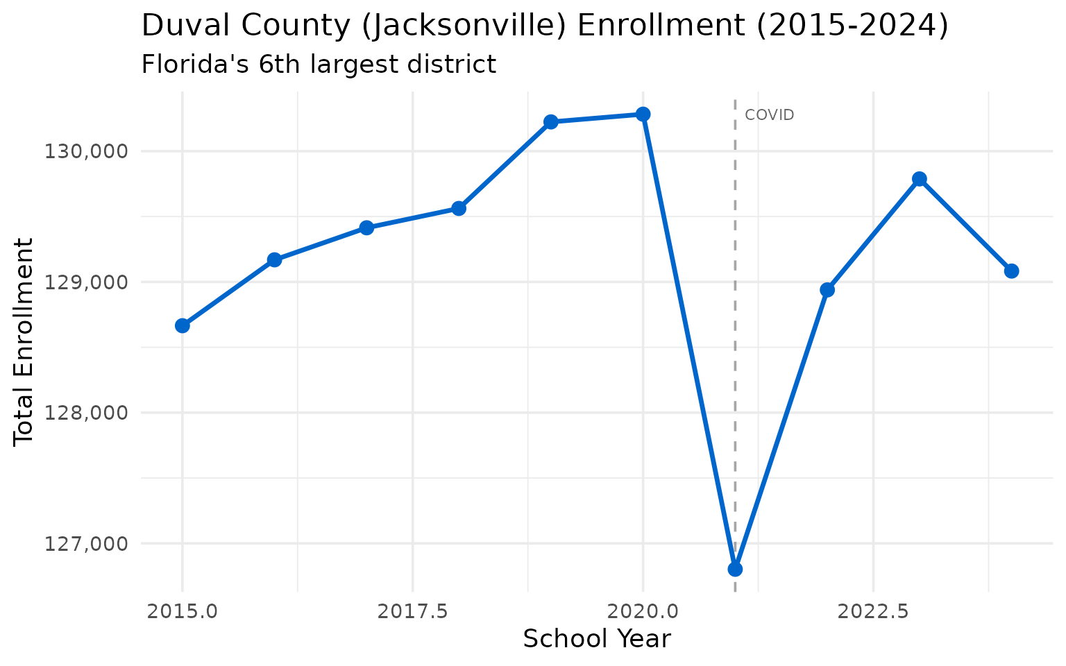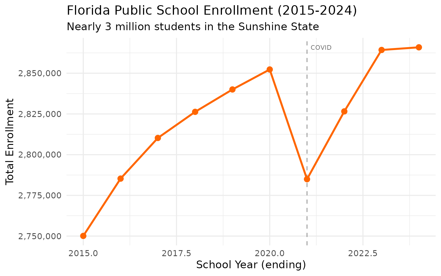 theme_set(theme_minimal(base_size = 14))This vignette explores Florida’s public school enrollment data, surfacing key trends and demographic patterns across recent years (2015-2024).