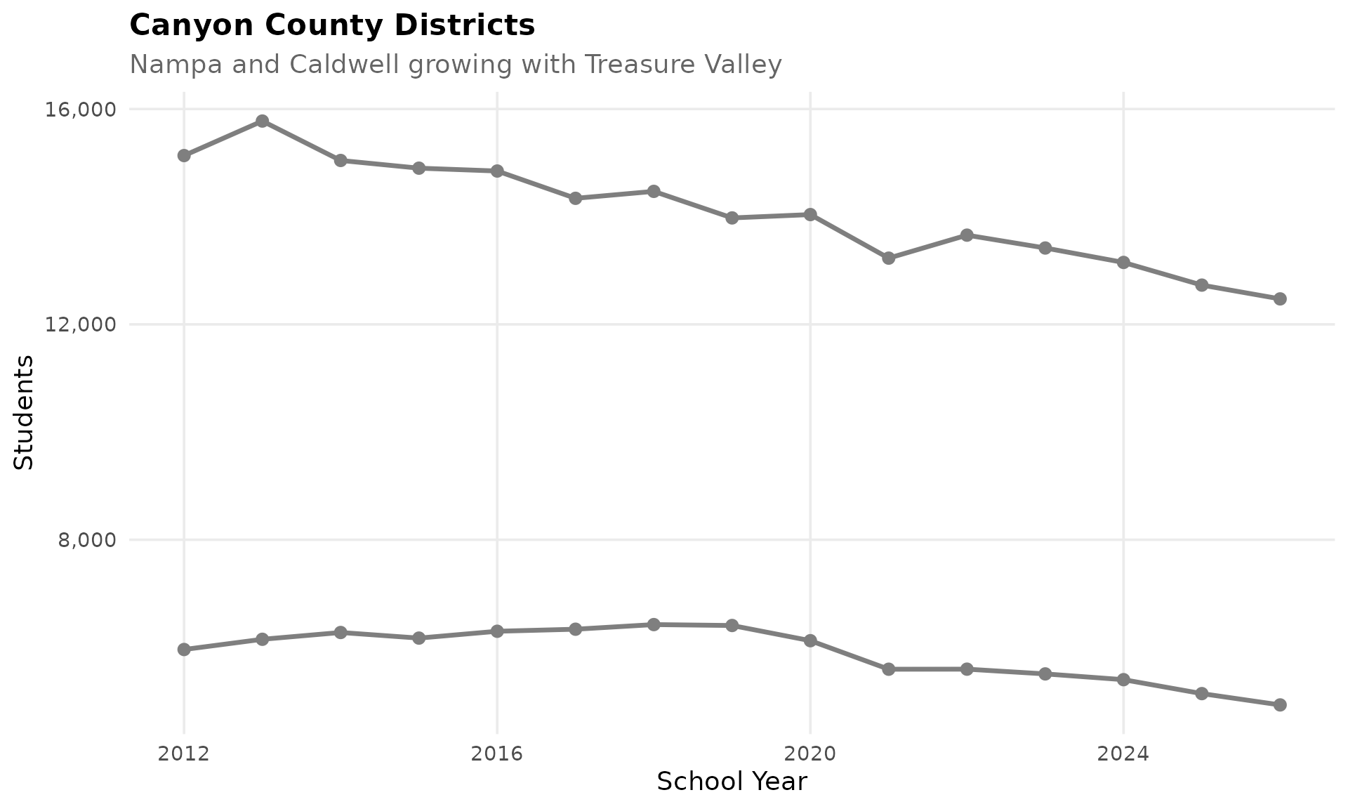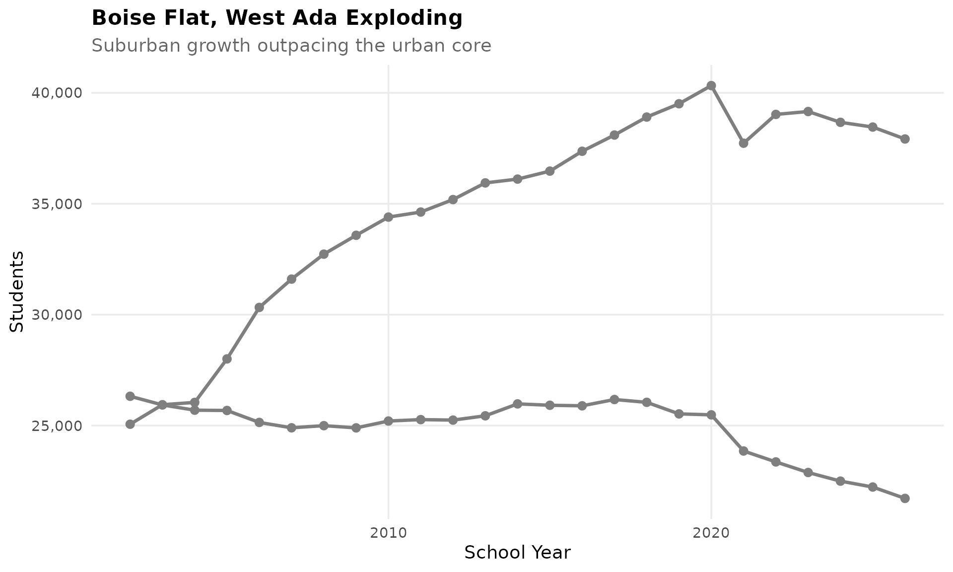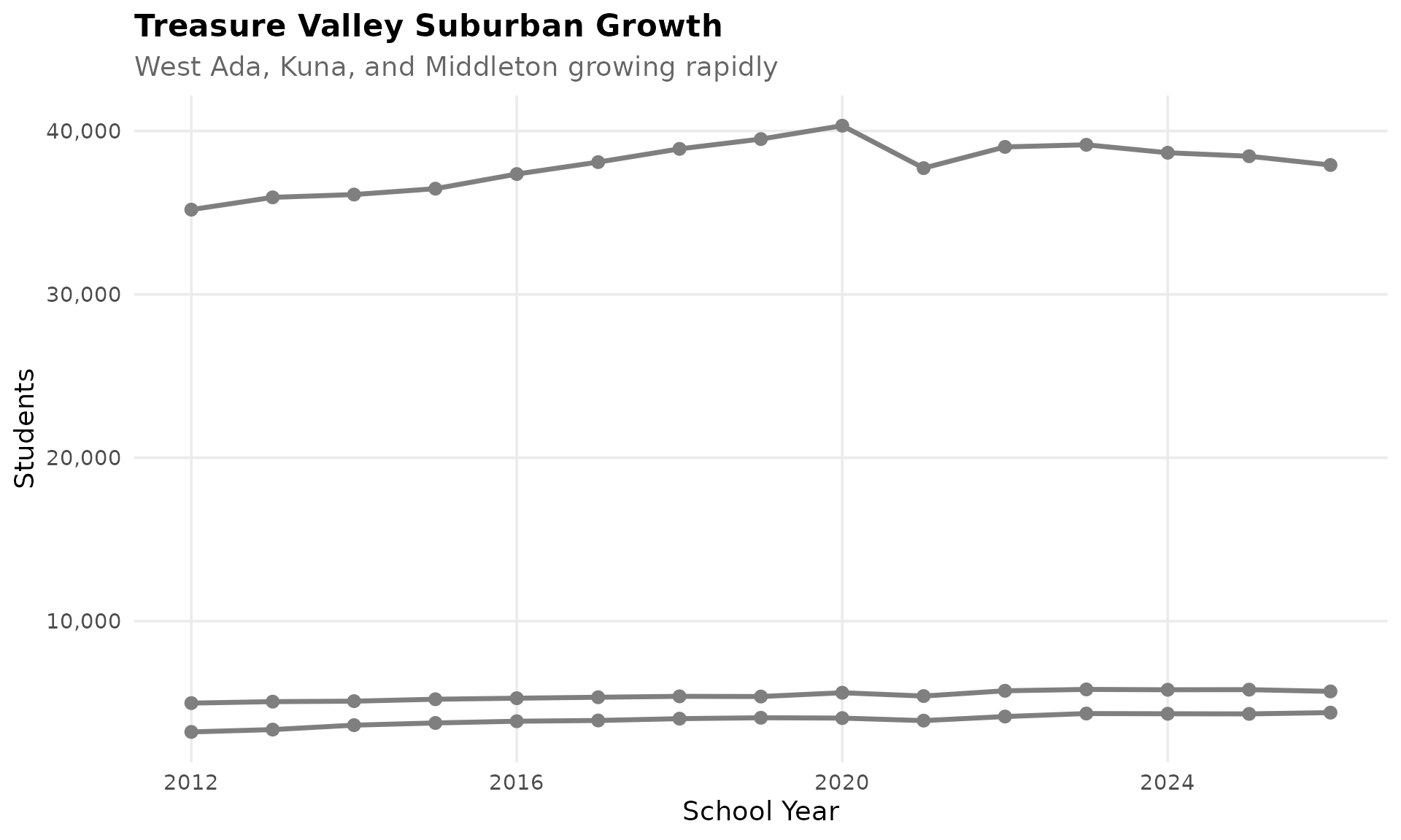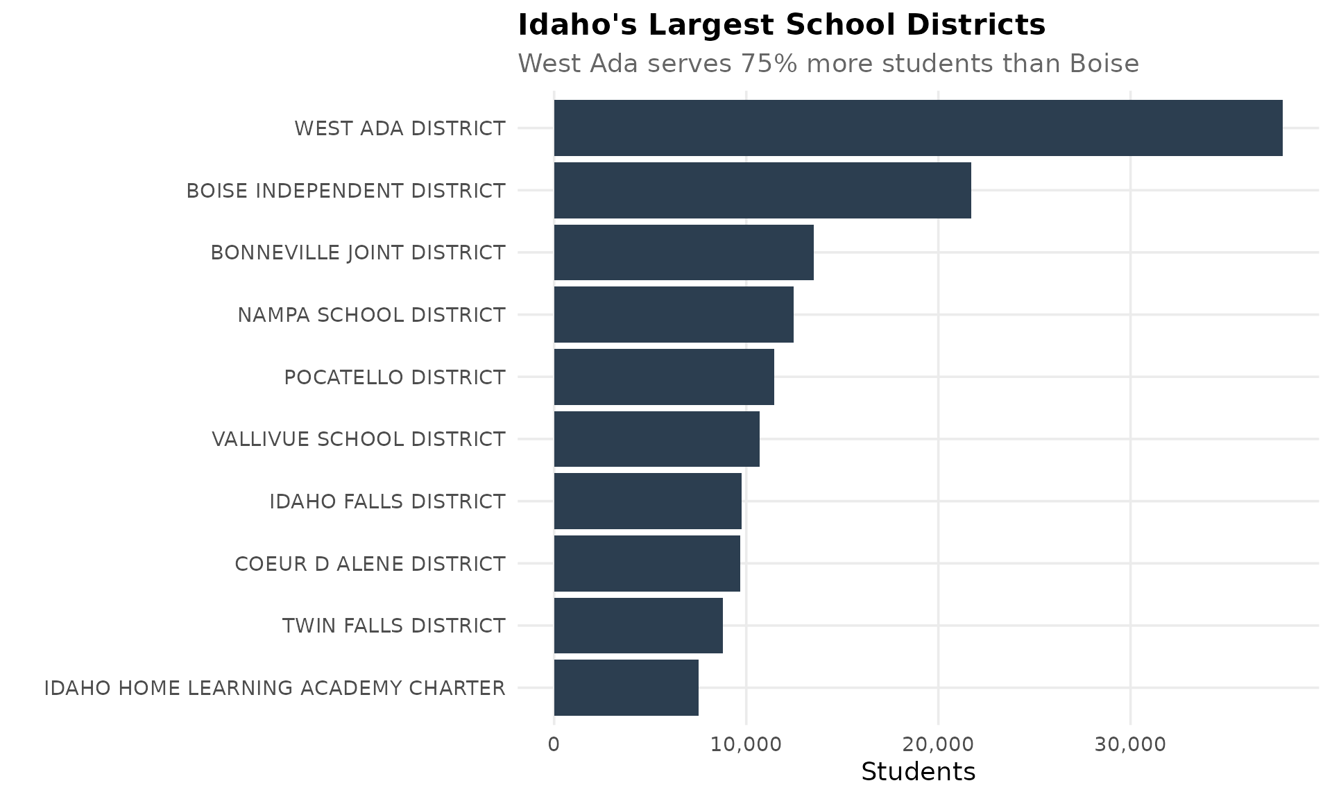 West Ada School District in suburban Boise (Meridian/Eagle area) serves nearly 38,000 students - 75% larger than Boise itself. It’s the largest district in the state and still growing.