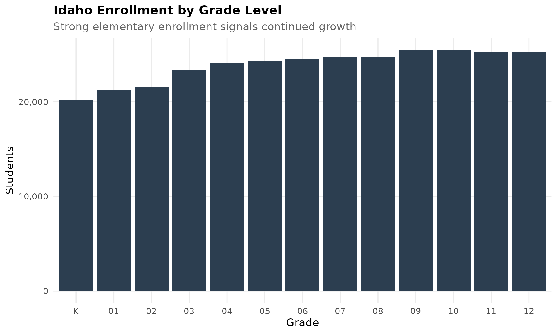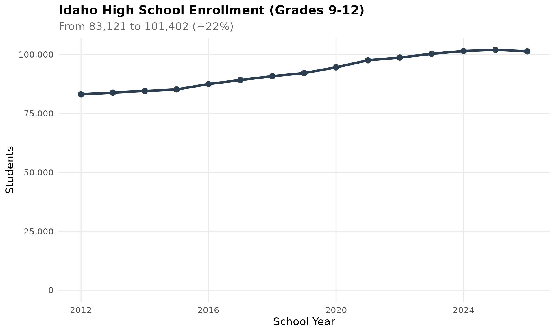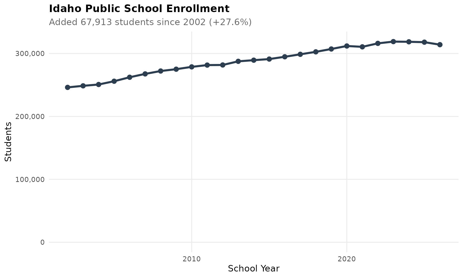 enr_current <- fetch_enr(max_year, use_cache = TRUE)1. Idaho’s enrollment grew 28% in 24 years