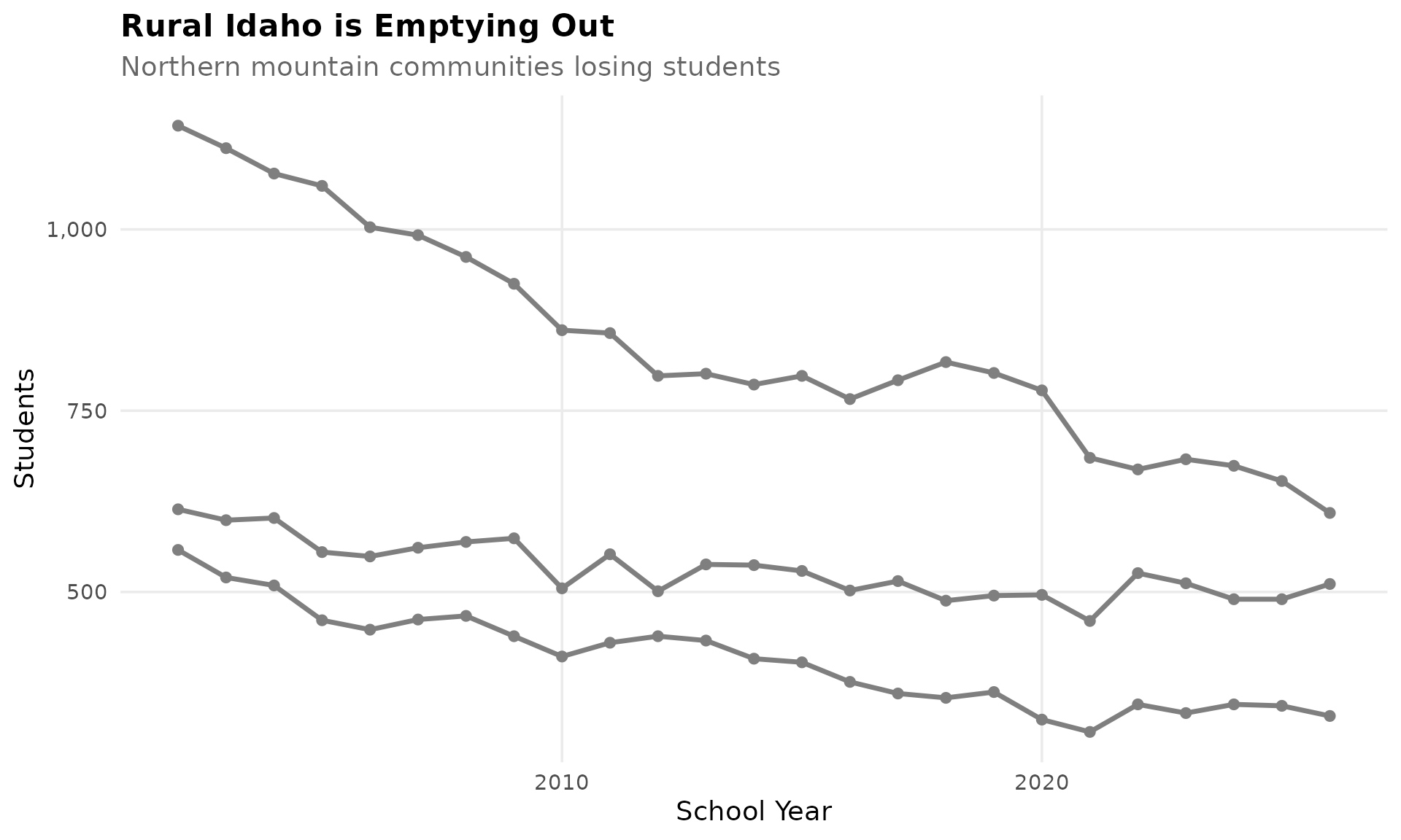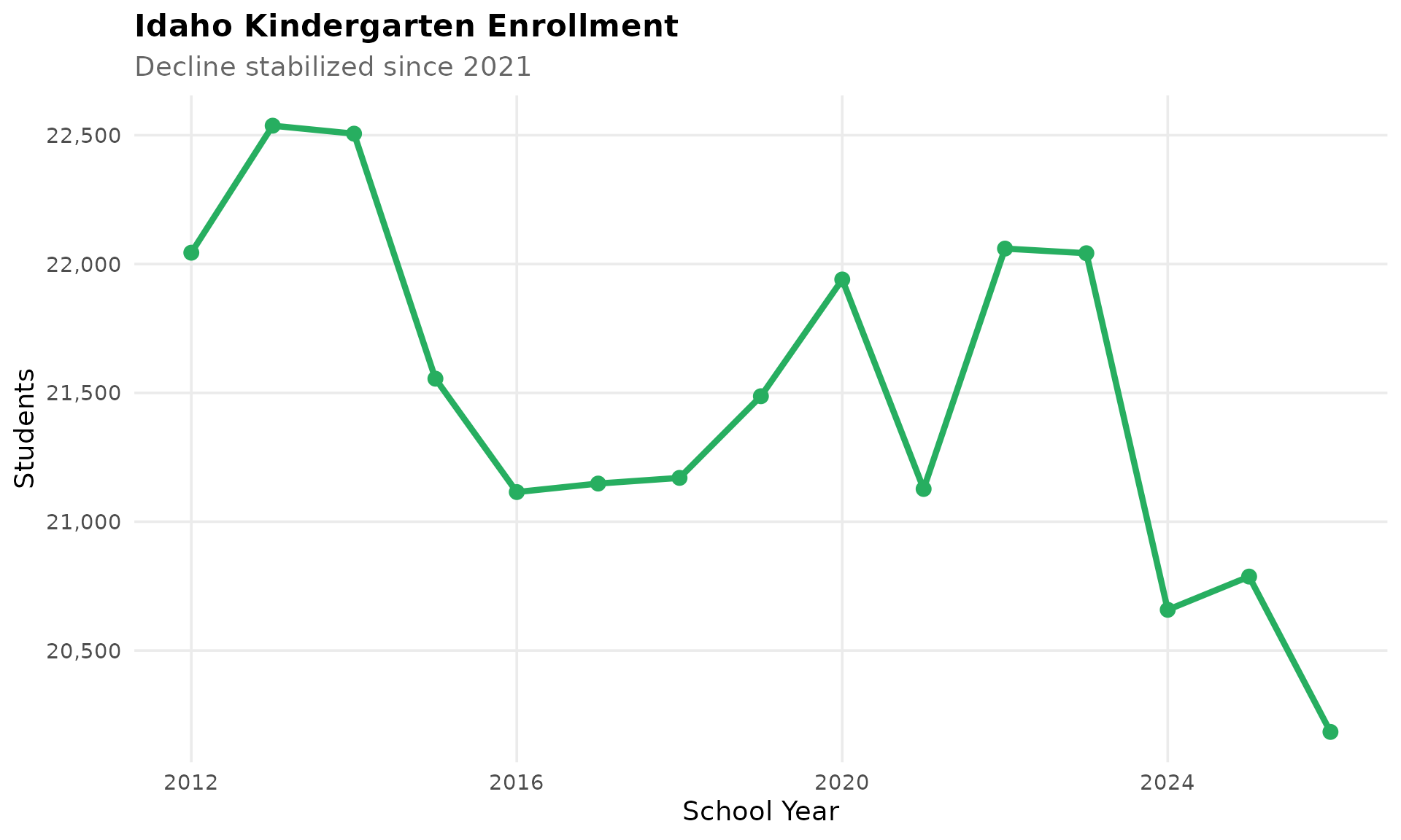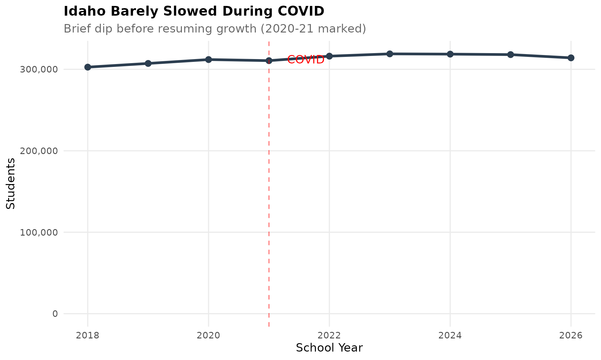 enr_current <- fetch_enr(max_year, use_cache = TRUE)1. Idaho’s enrollment grew 28% in 24 years