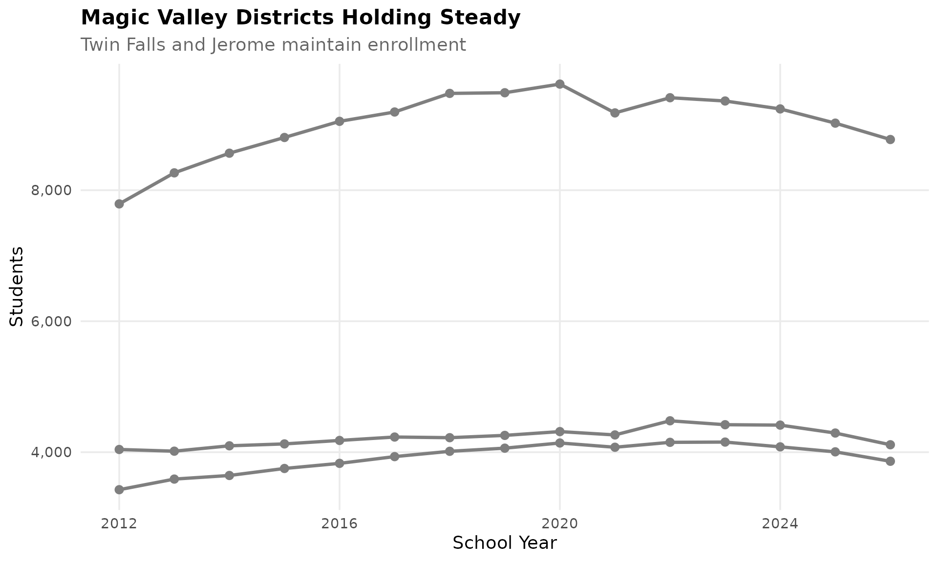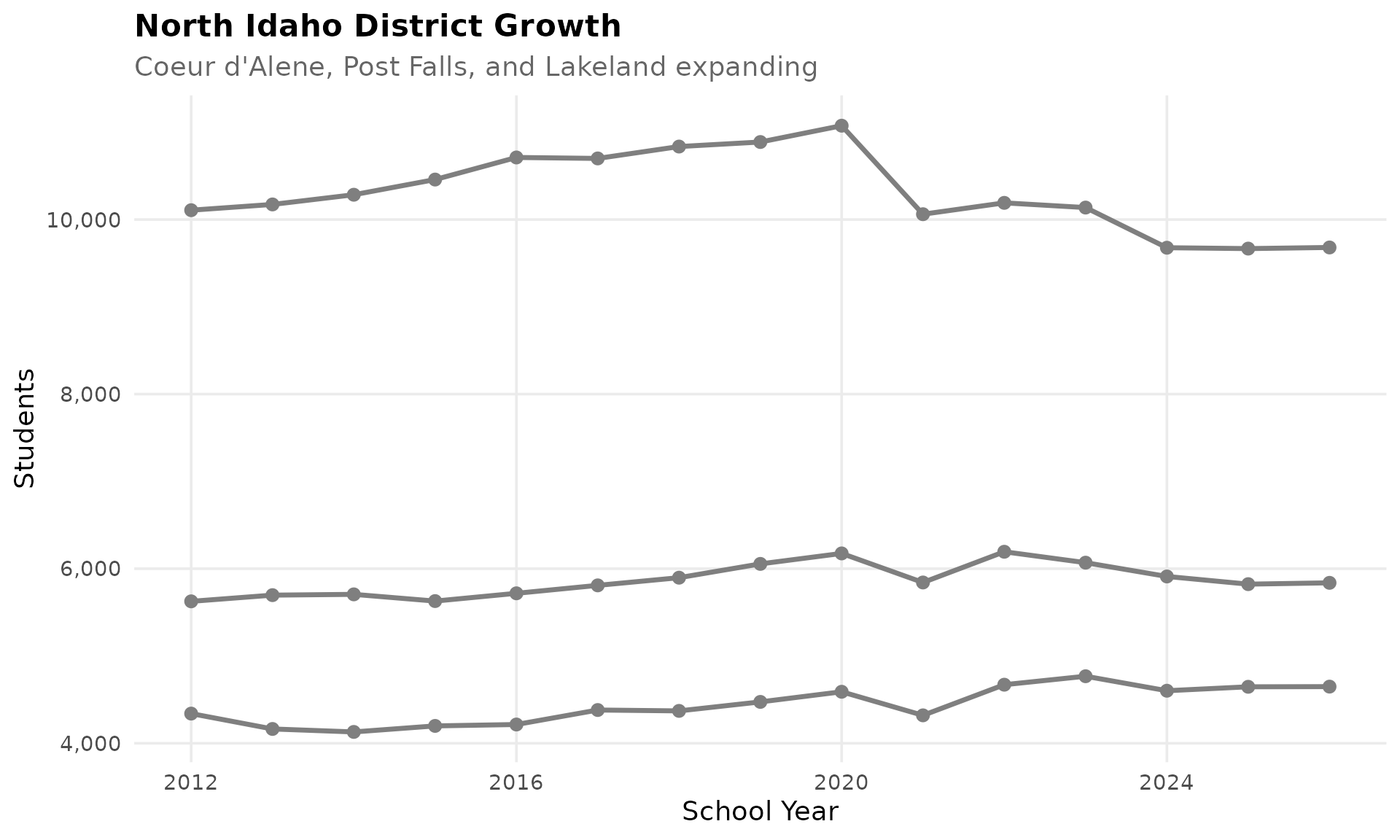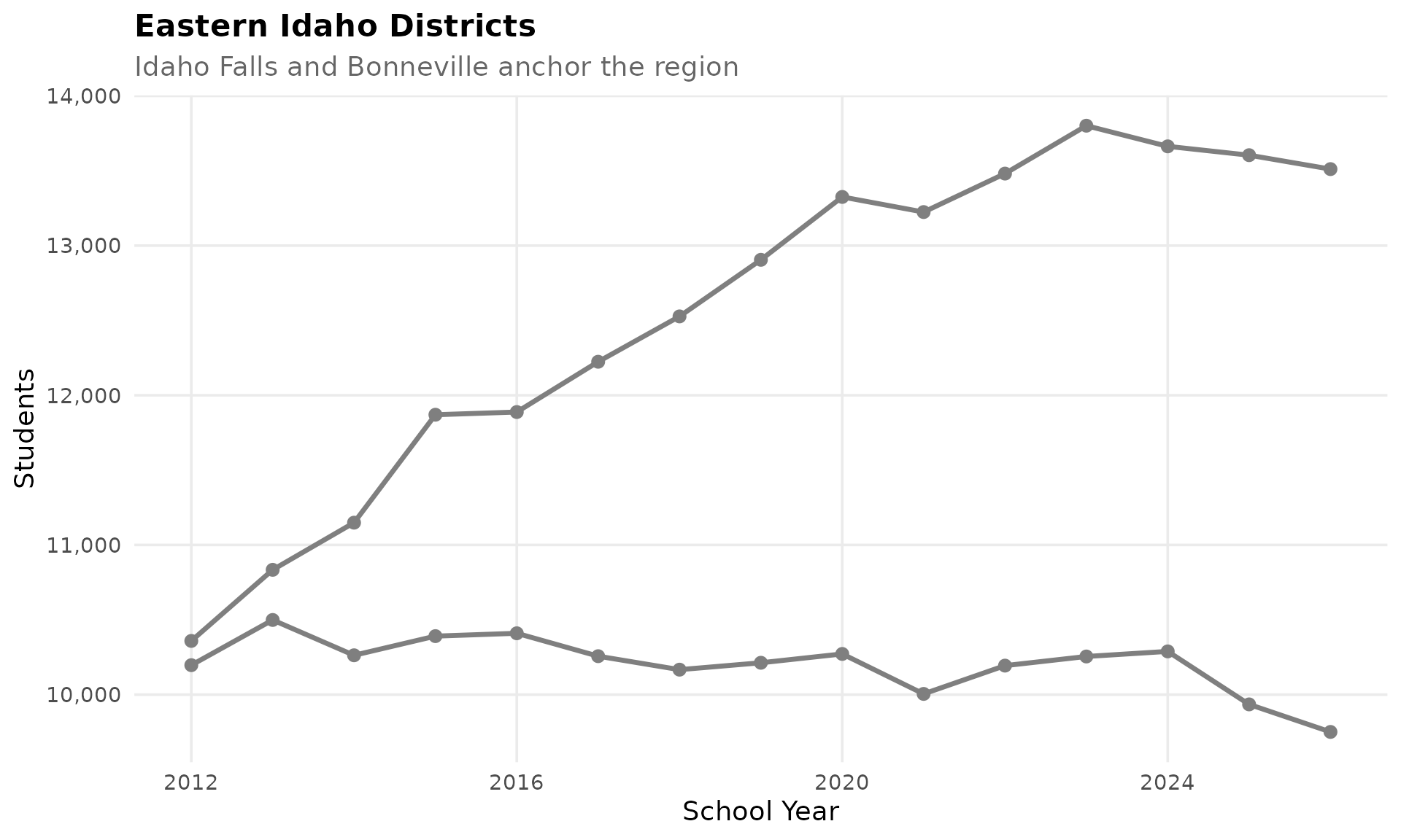 Idaho Falls School District (#91) anchors the eastern region with nearly 10,000 students. Nearby Bonneville Joint District serves the growing suburban areas with 13,500 students. Eastern Idaho grows more slowly than the Treasure Valley.