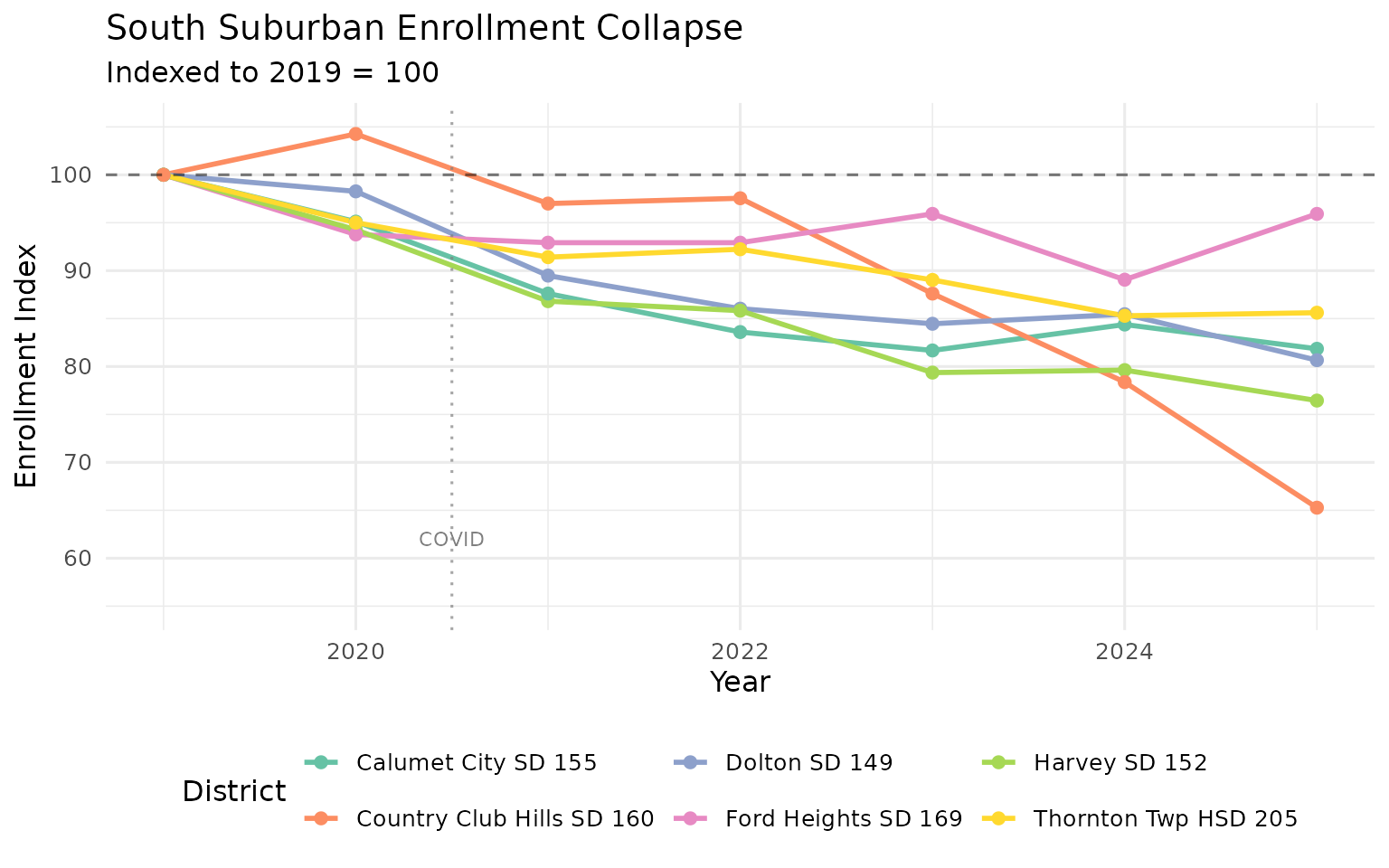 South suburban Cook County has experienced population collapse unlike anywhere else in Illinois. Country Club Hills SD 160 lost 35% of its students in just six years.