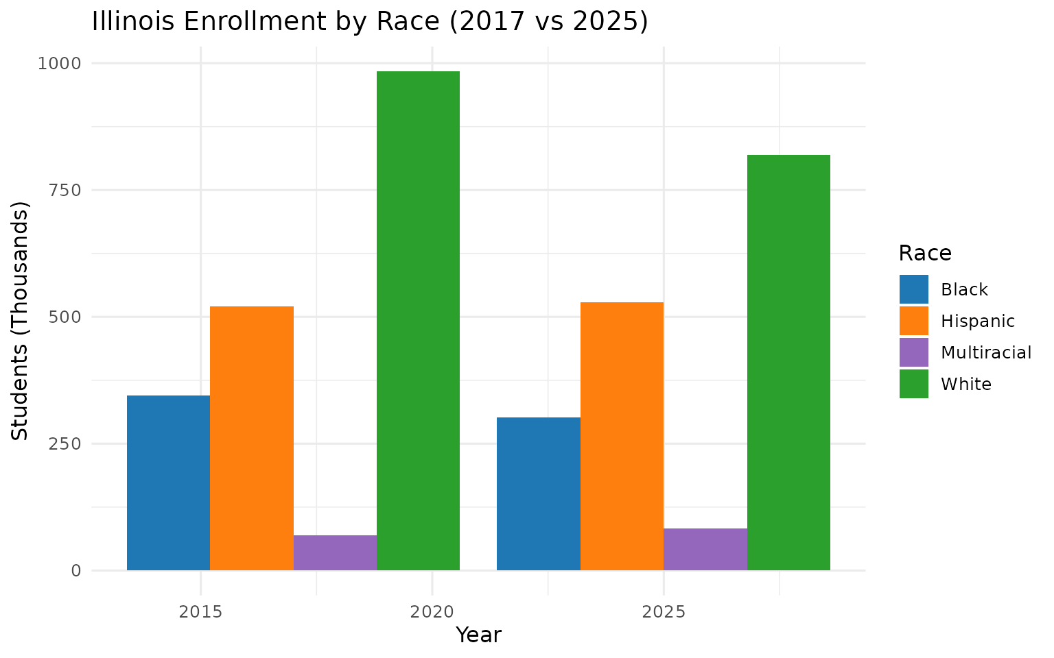 Multiracial students are the fastest-growing demographic in Illinois schools. From 2017 to 2025, multiracial enrollment grew 21% while White enrollment fell 17% and Black enrollment fell 13%.