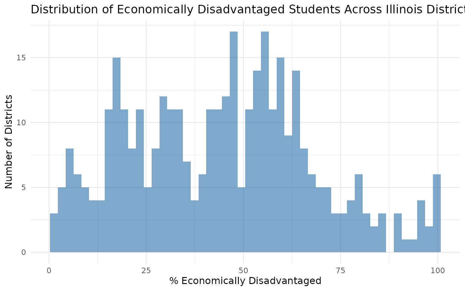 Dolton SD 149 has a 99.7% economically disadvantaged rate—nearly every student qualifies. Contrast this with Lake Forest SD 67 at just 1.3%.