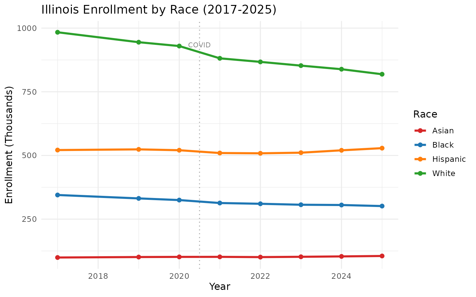 title = "Illinois Enrollment by Race (2017 vs 2025)",