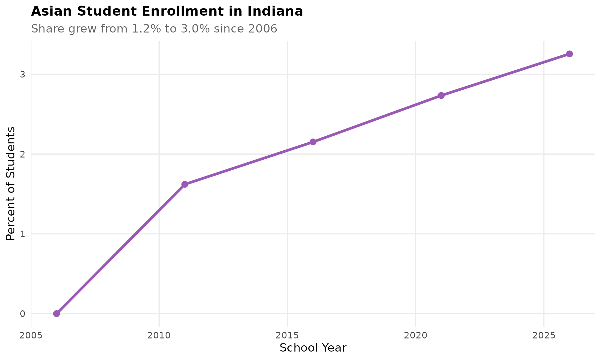 Asian enrollment went from 1.2% to 3.0% of Indiana’s total since 2006. While a smaller population than Hispanic growth, it represents a 2.5x increase in share.