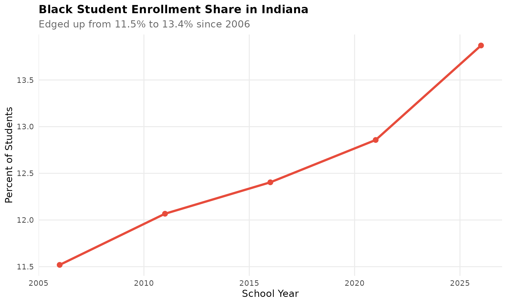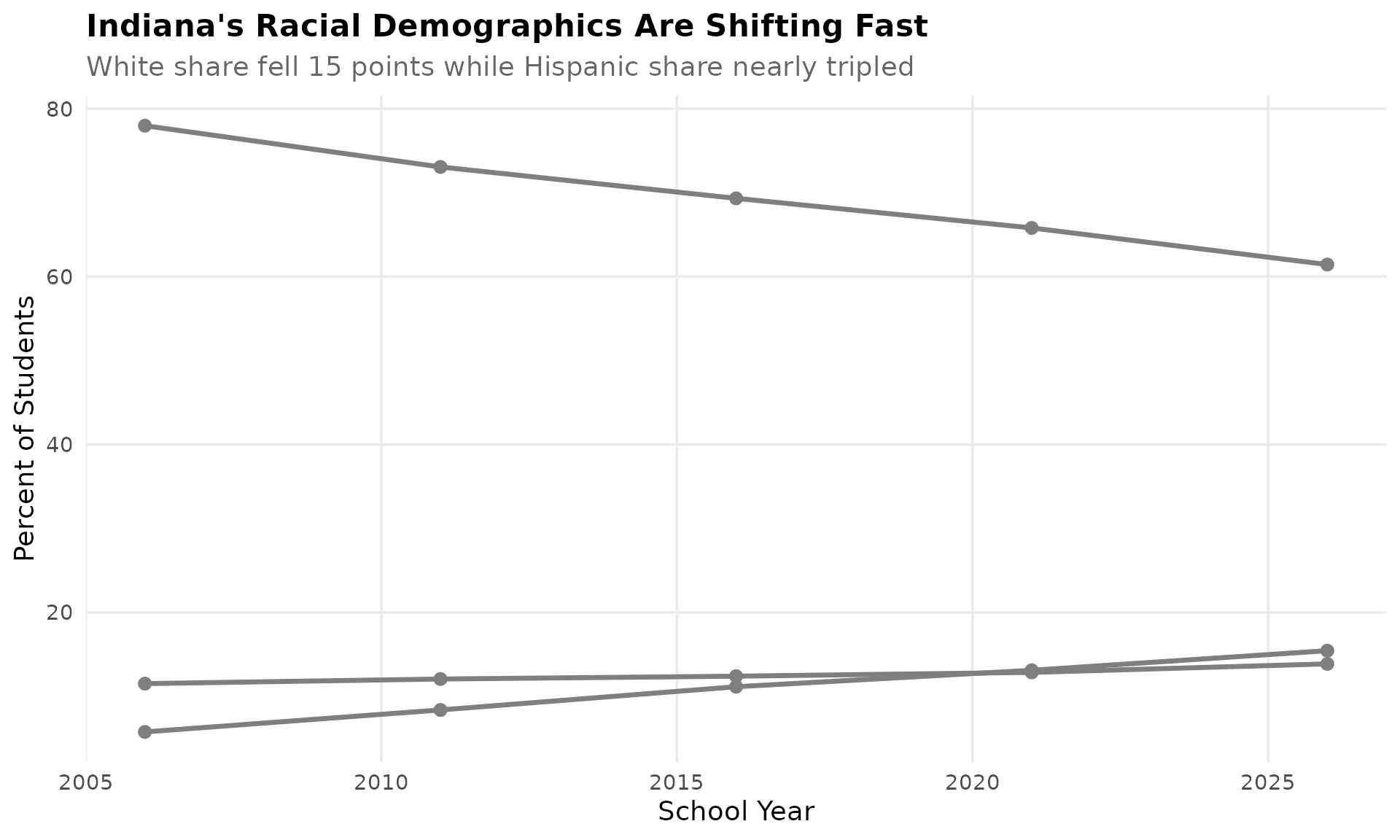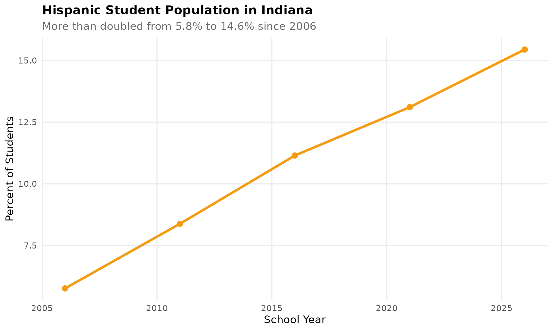 Hispanic students grew from 5.8% to 14.6% of enrollment since 2006, a 2.5x increase. Northwest Indiana and Indianapolis drive this demographic shift.