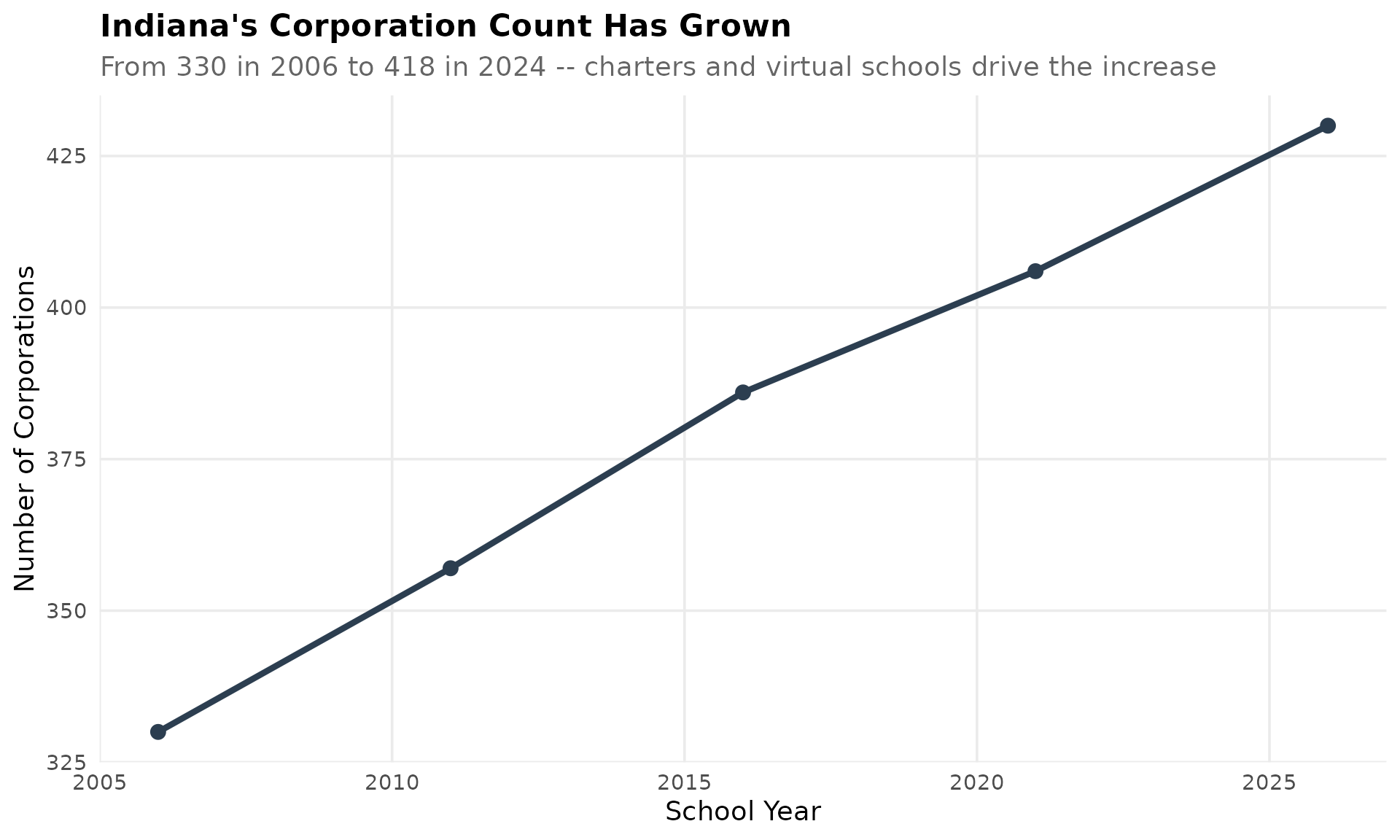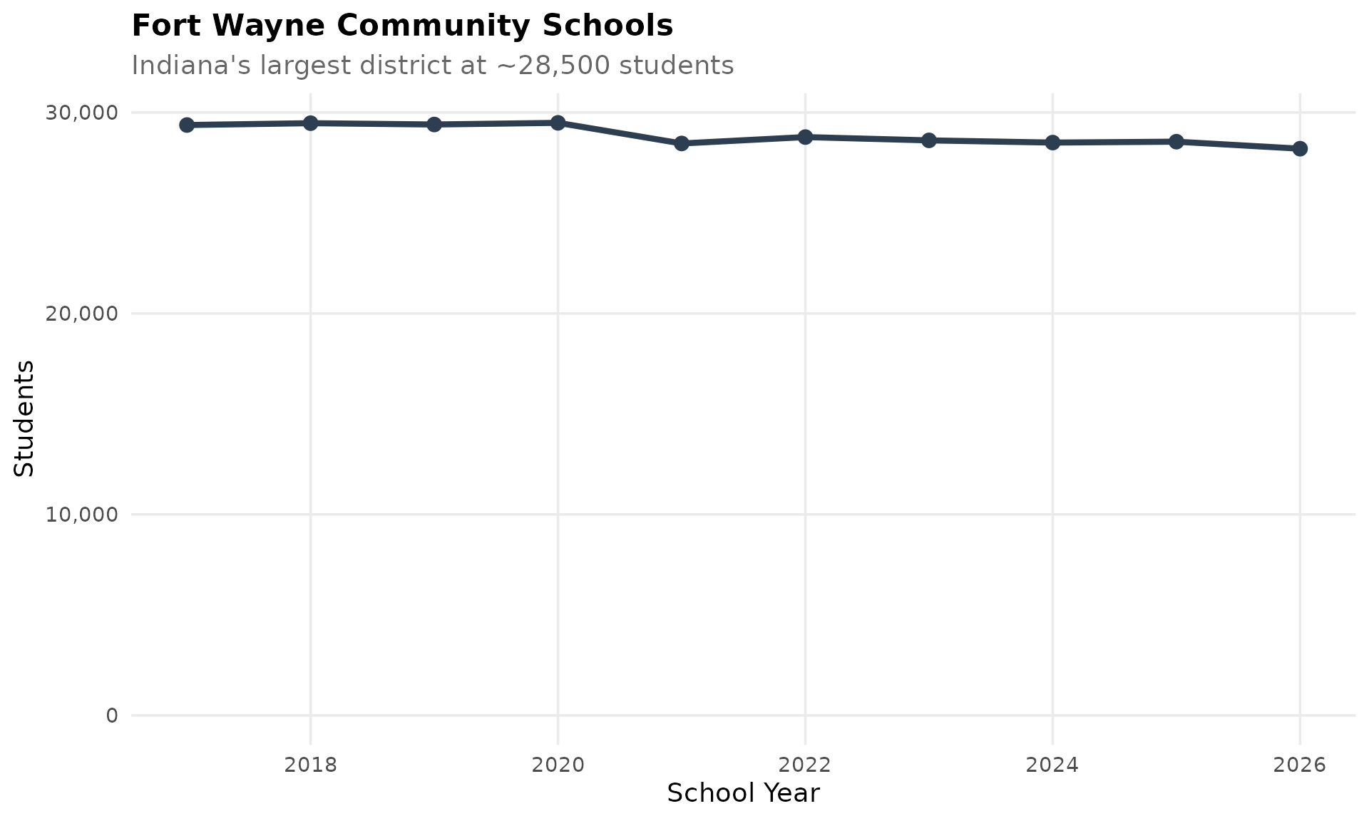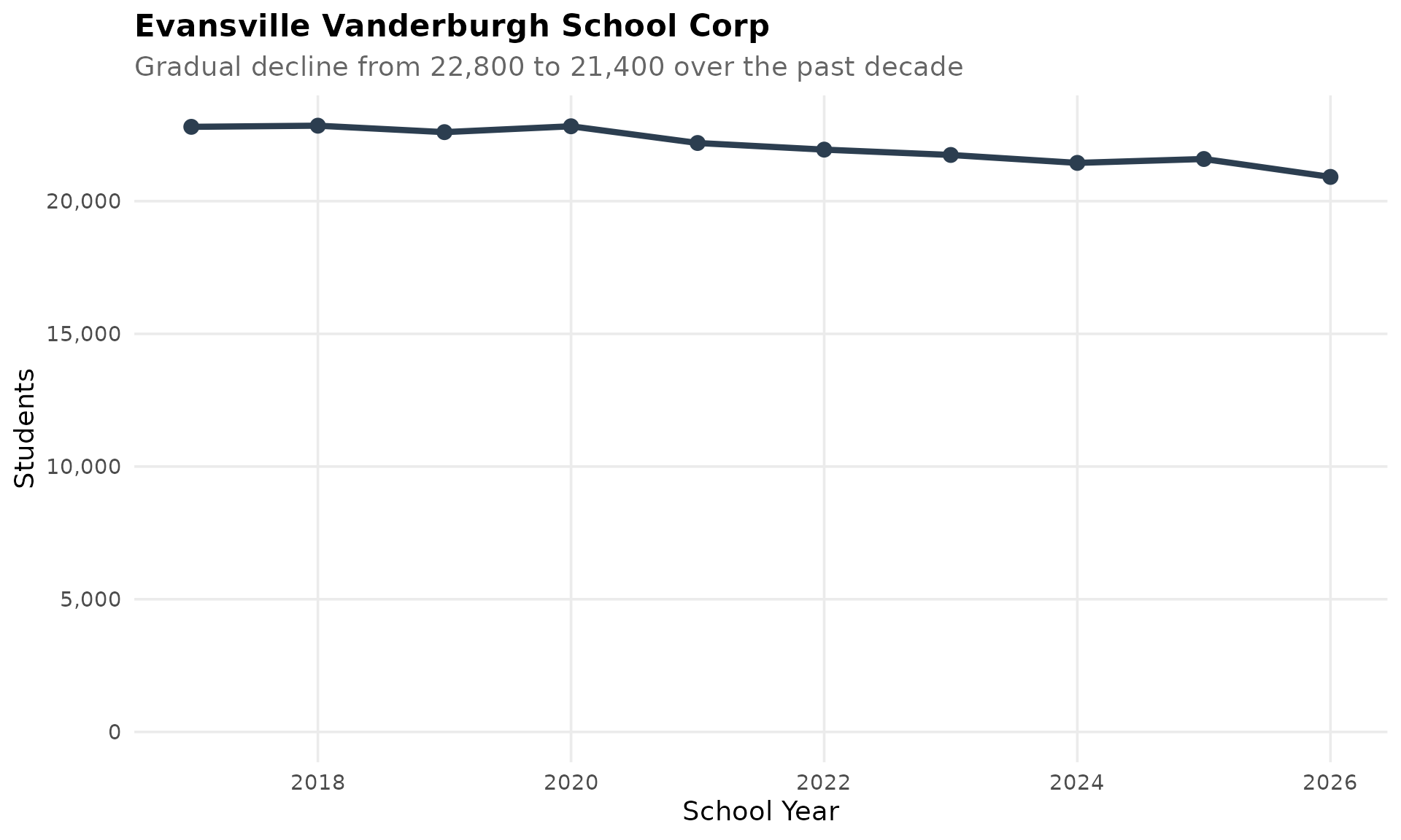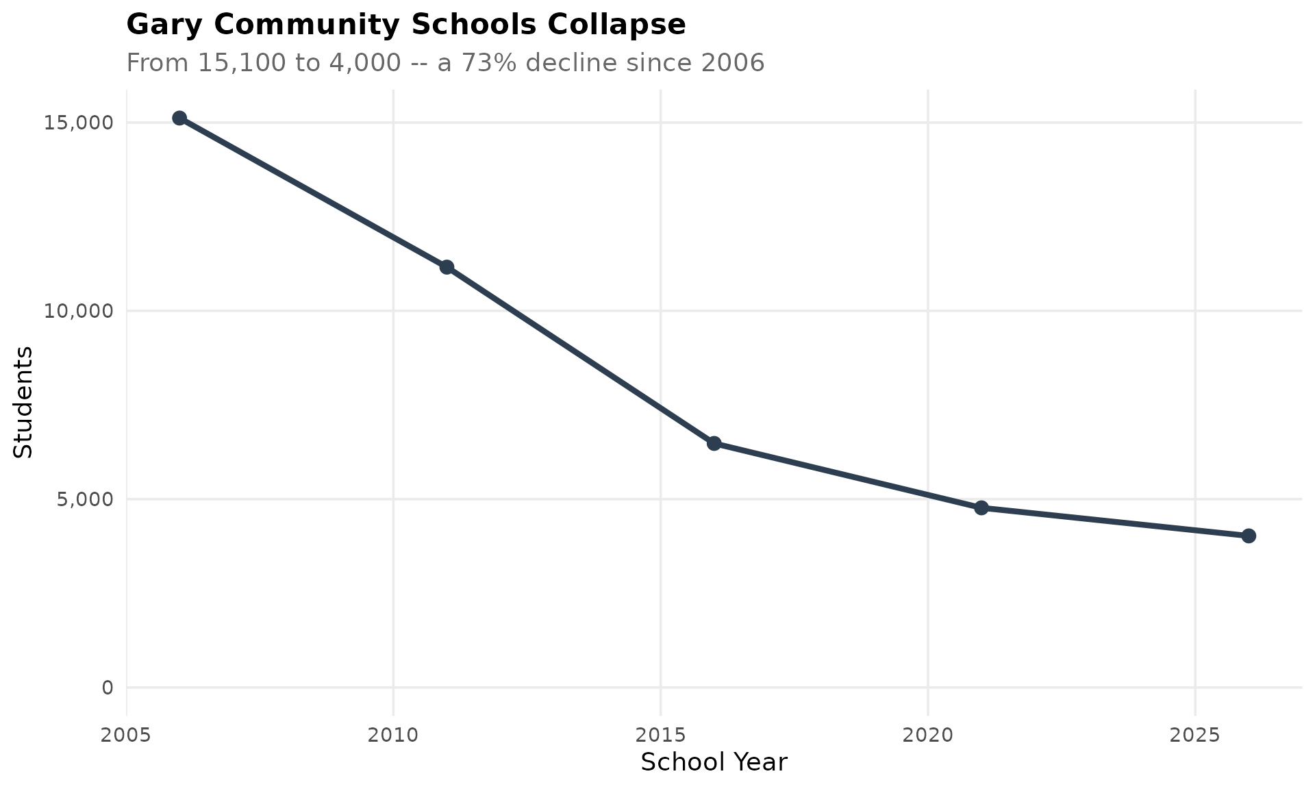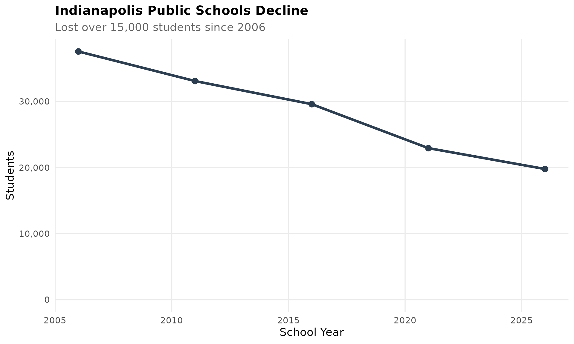 IPS enrollment dropped from 37,554 in 2006 to under 22,000 by 2024 – a 42% decline. Charter schools and suburban flight continue to reshape Indianapolis education.