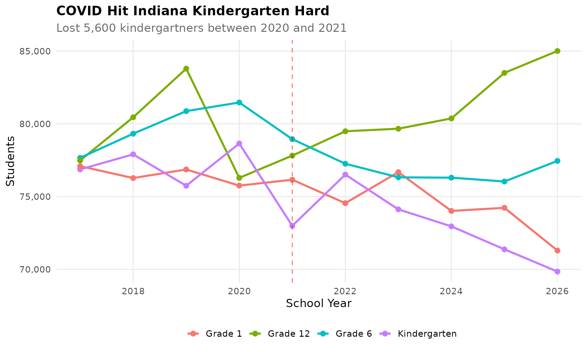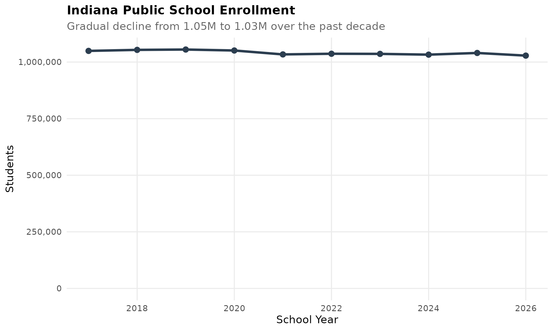 Indiana enrollment peaked above 1.08 million in 2006 and has steadily declined to just over 1.03 million. The state lost about 5% of its public school enrollment over two decades.