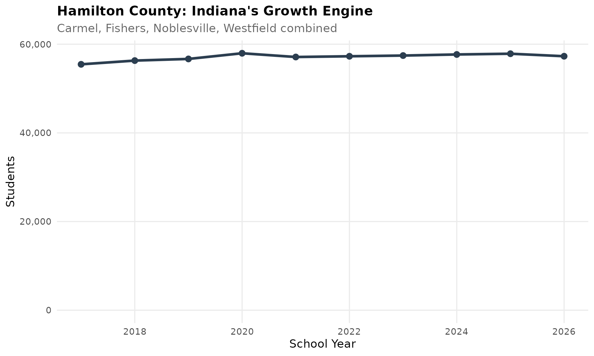Carmel, Fishers, Westfield, and Noblesville suburbs are booming. These four Hamilton County corporations grew from about 42,000 to nearly 58,000 students – a 38% increase.