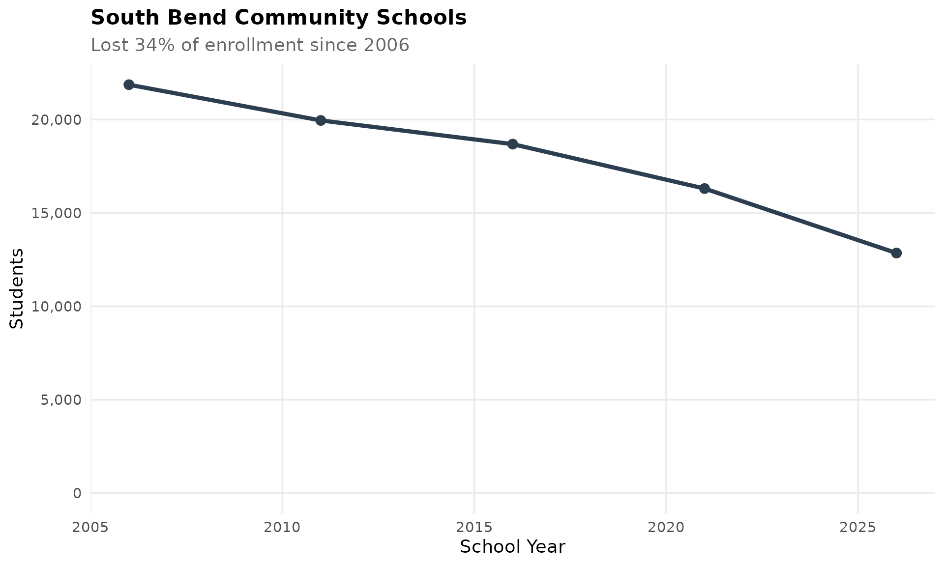 South Bend Community School Corp went from nearly 21,900 students in 2006 to about 14,500 in 2024 – a loss of 34%.