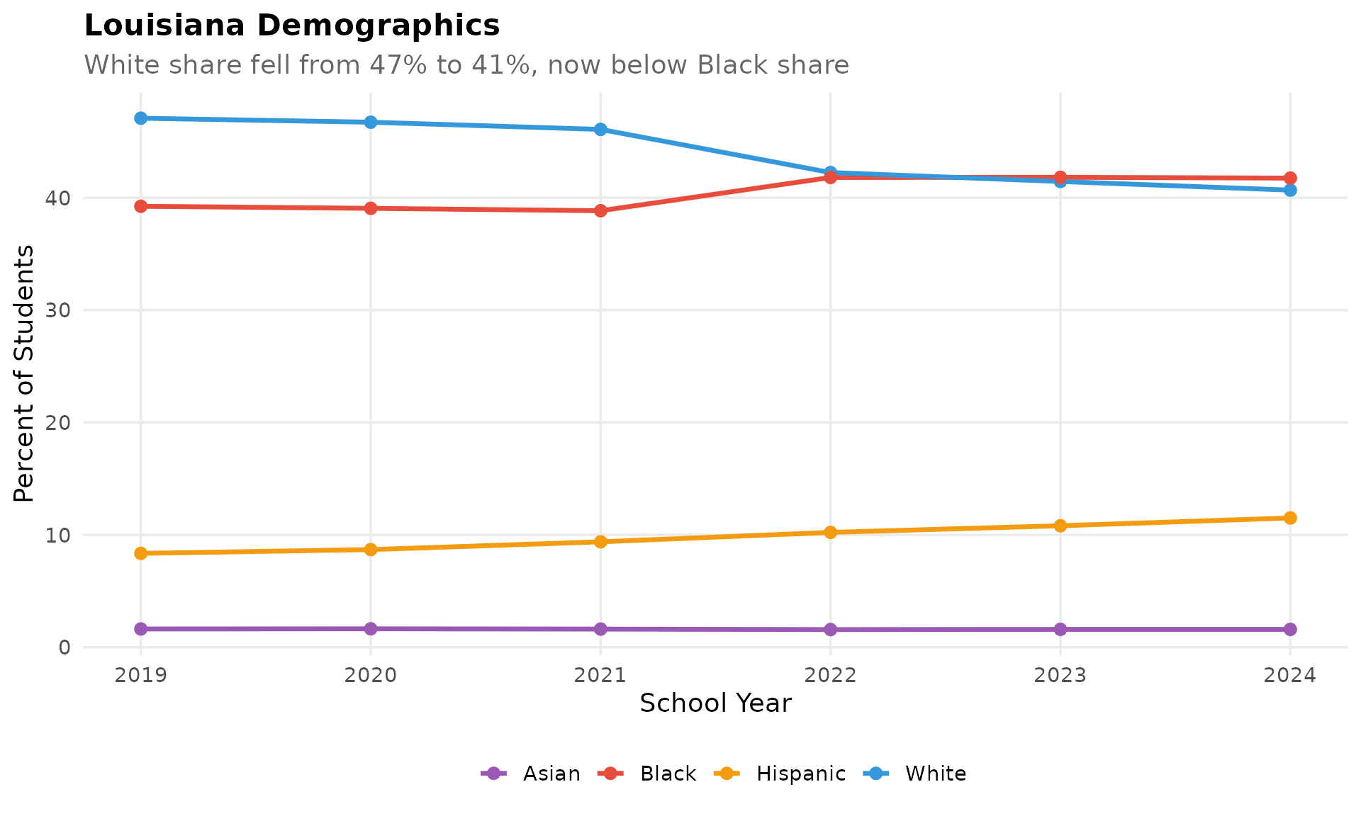 subtitle = "White share fell from 47% to 41%, now below Black share",