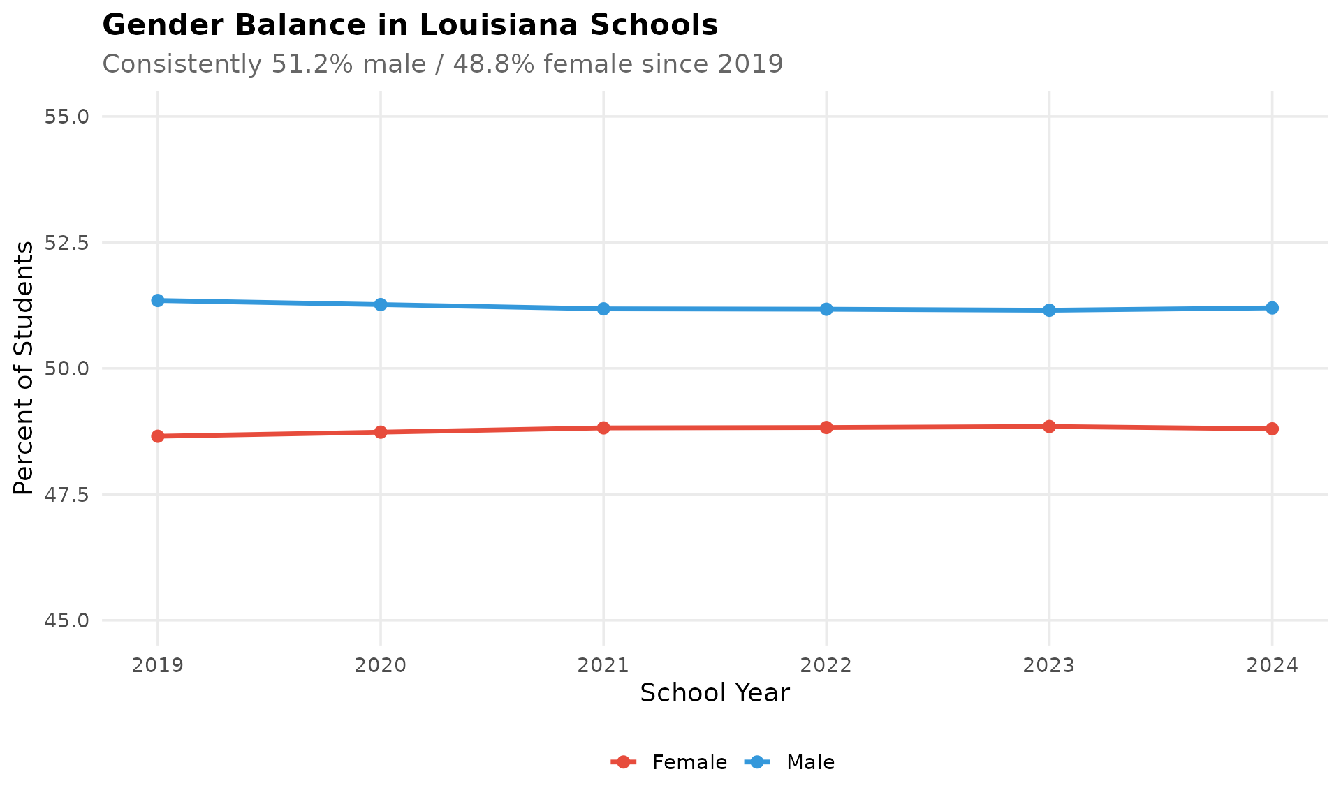 Louisiana’s 51.2% male / 48.8% female split has barely budged across all six years of data.
