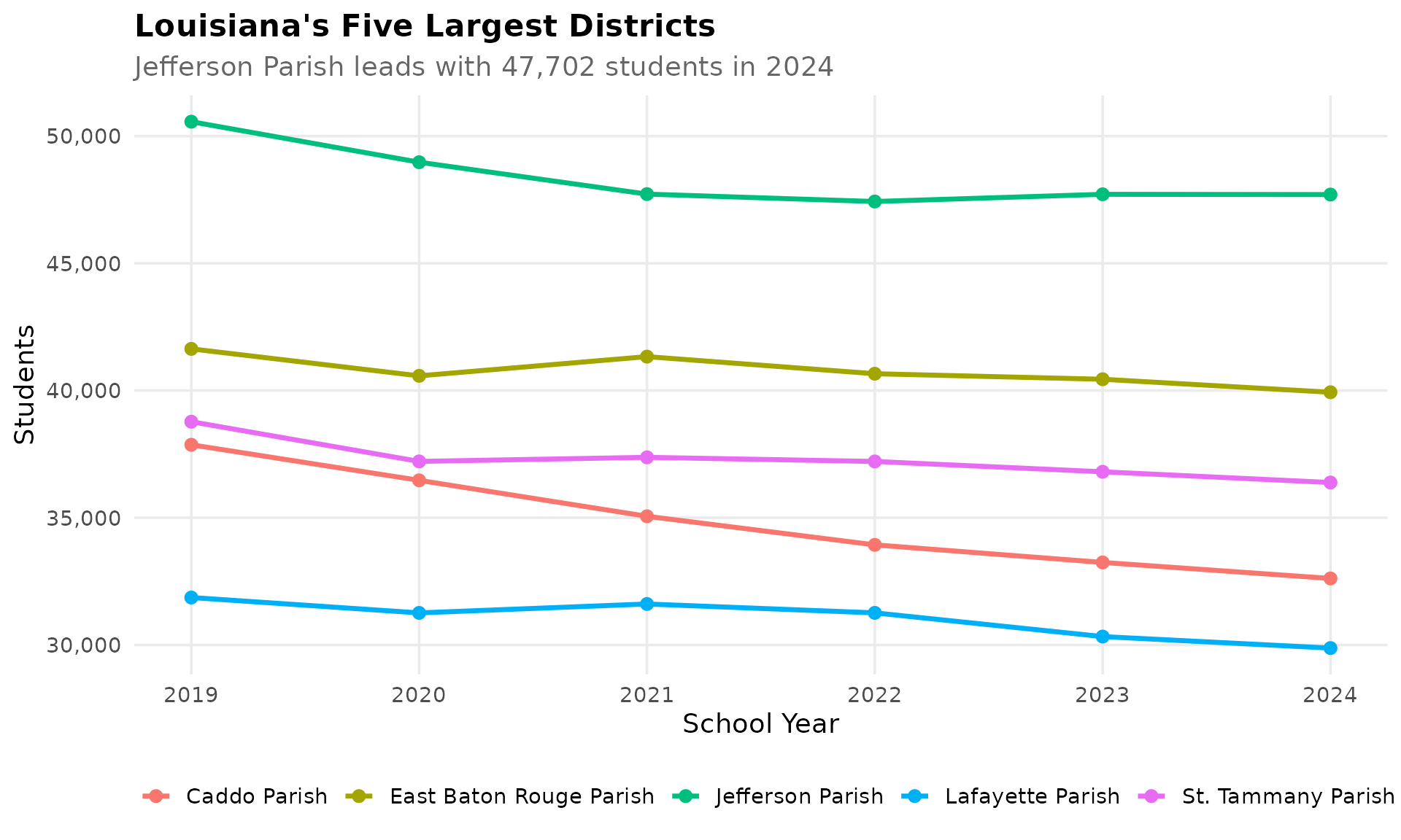 Jefferson Parish enrolls 47,702 students, leading all districts and outpacing East Baton Rouge (39,932) and St. Tammany (36,384).