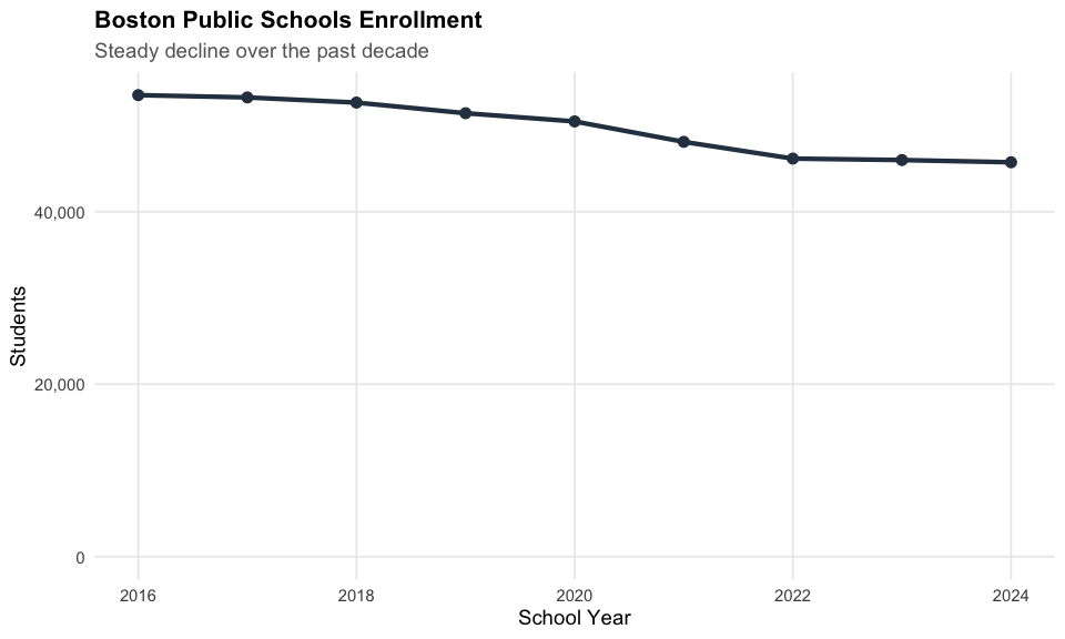 Boston Public Schools enrollment has fallen from over 51,000 in 2016 to under 46,000 in 2024, a decline of more than 6,000 students.