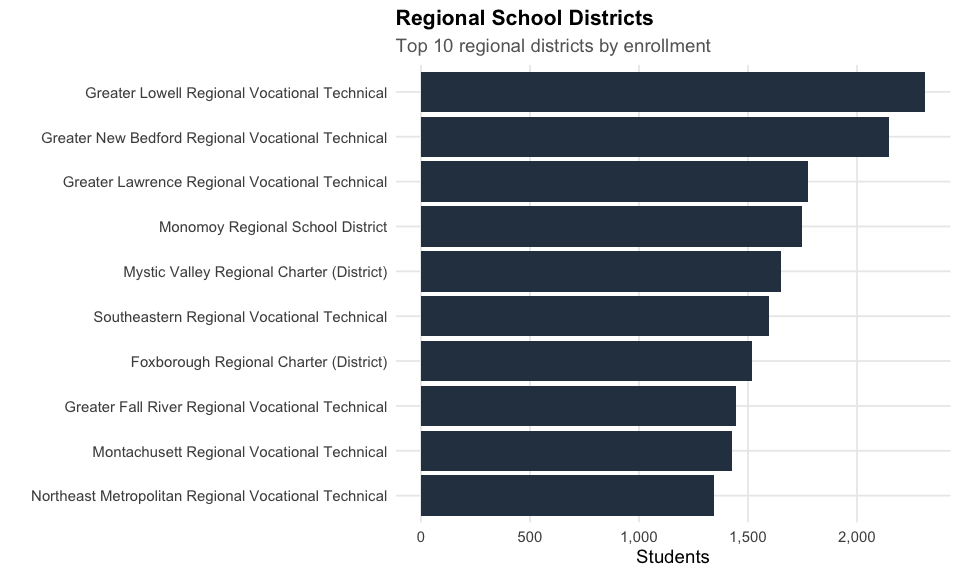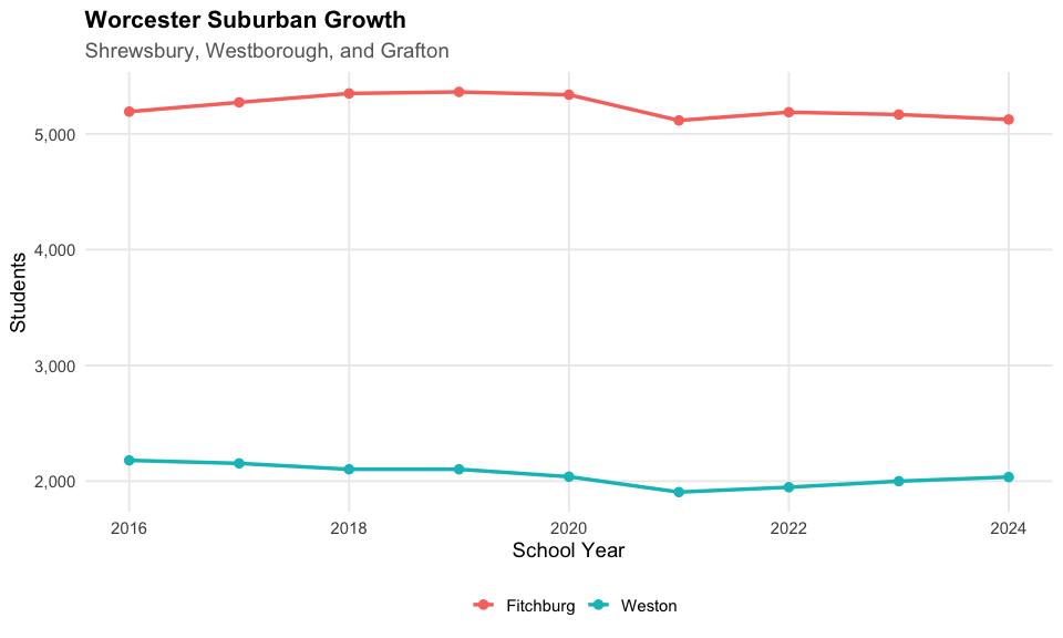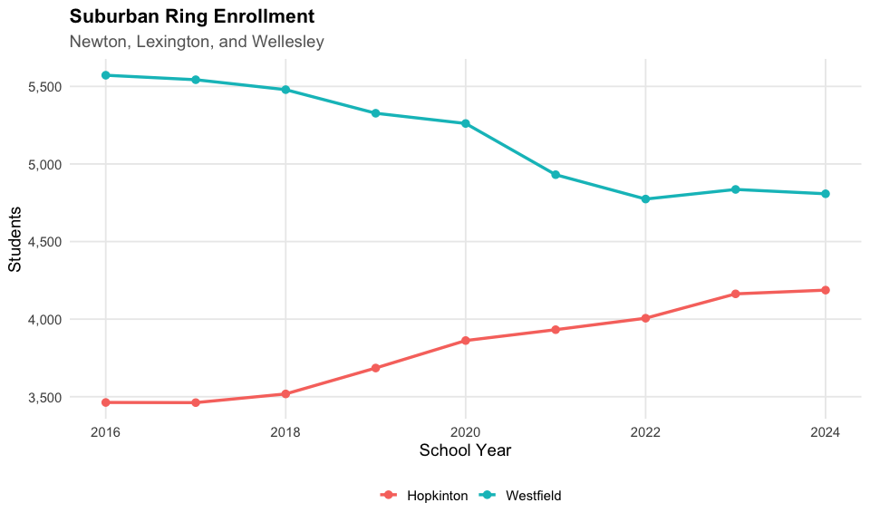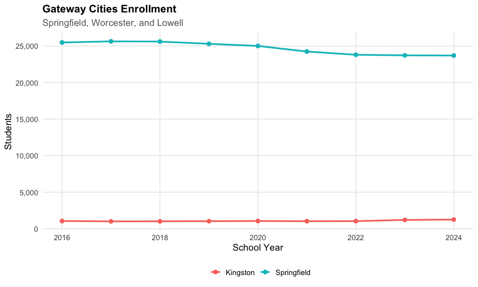 Springfield, Worcester, and Lowell – Massachusetts’ “Gateway Cities” – show different enrollment trajectories. Springfield has declined while Worcester and Lowell hold relatively steady.