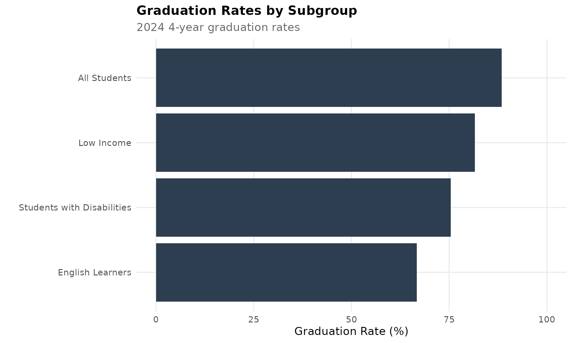 English learners (67%) and students with disabilities (75%) graduate at lower rates than peers.
