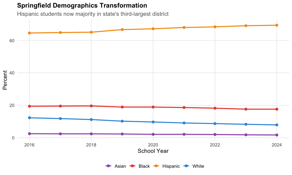 The state has gone from 62% white in 2016 to 53% in 2024. Hispanic students now make up 25% of enrollment.