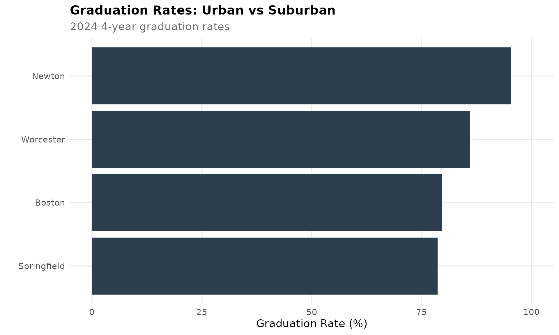 Boston (80%) trails Newton (95%) by 15 percentage points, reflecting opportunity gaps across the state.