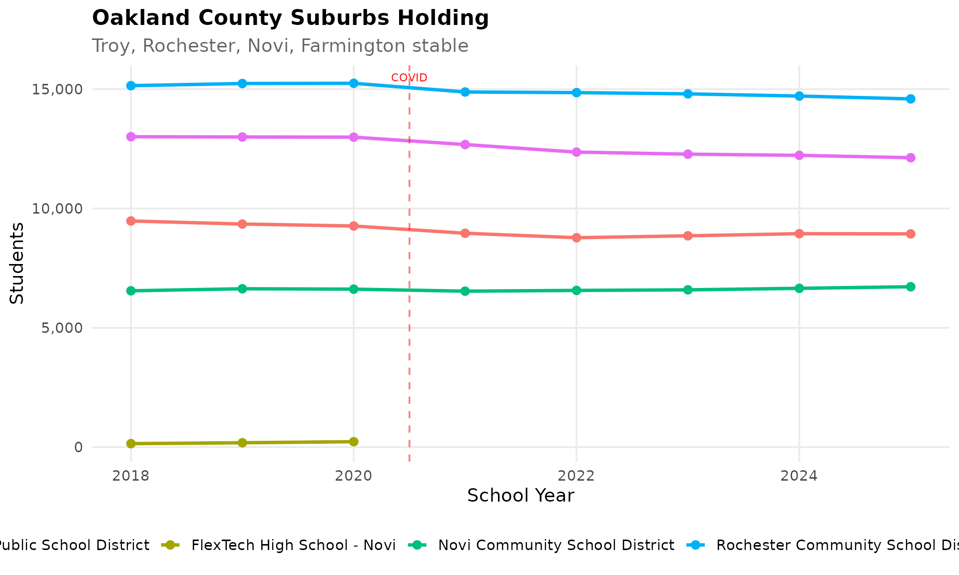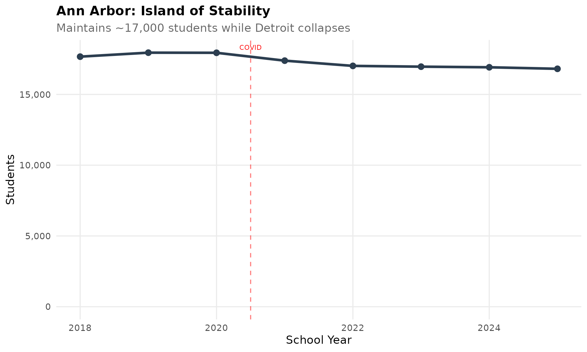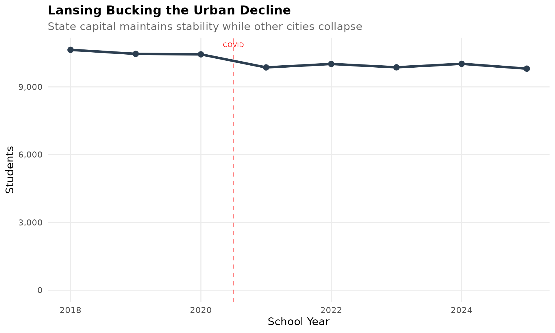Unlike Detroit and Flint, Lansing Public School District has maintained relatively stable enrollment around 10,000 students. The state capital’s diverse economy and state government employment provide a buffer.