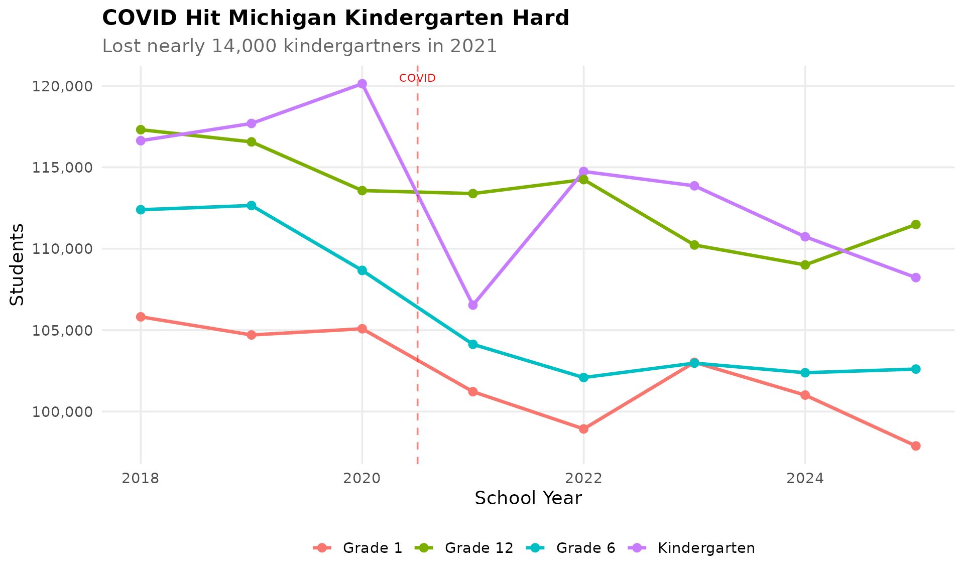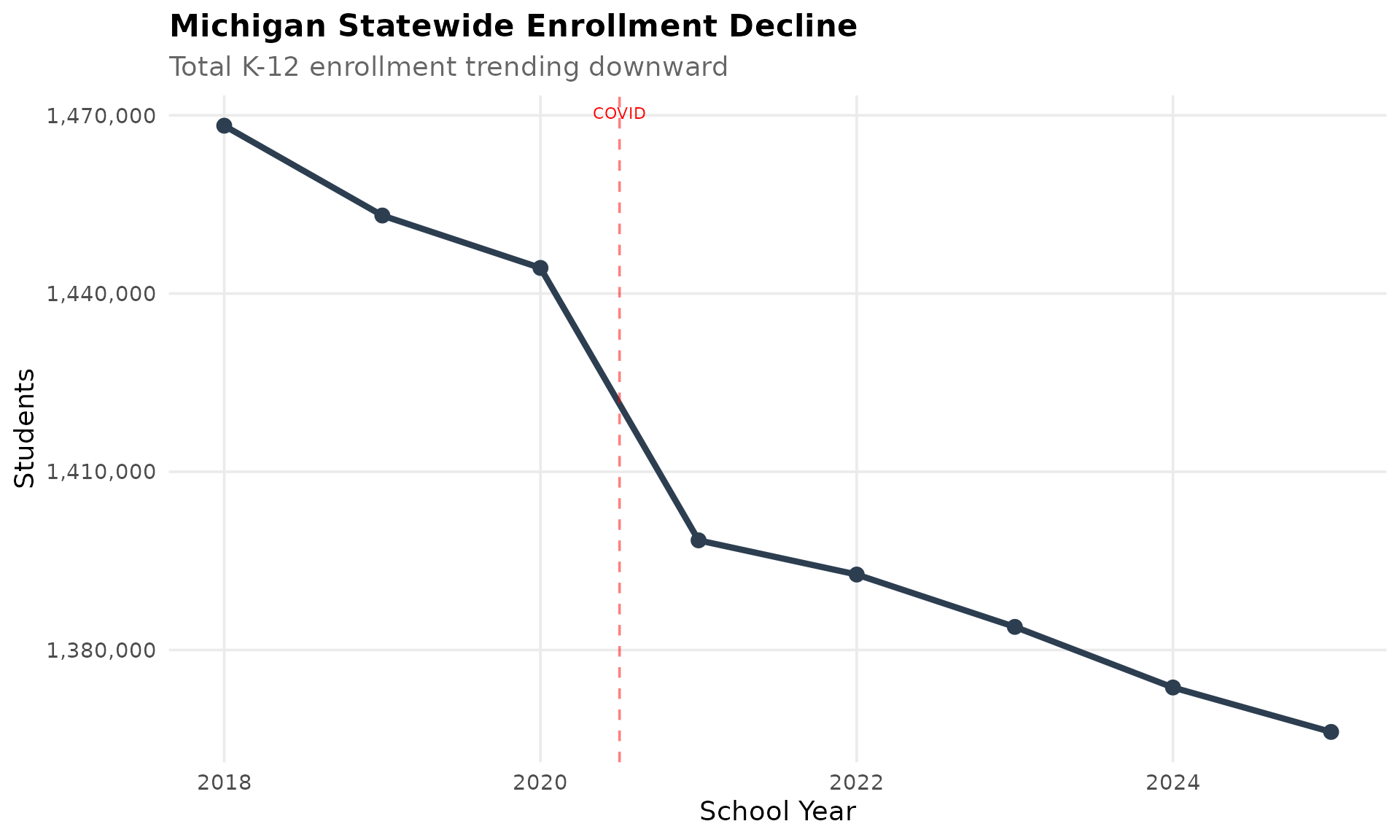 Michigan has lost over 100,000 students since 2018 alone, reflecting demographic shifts and economic changes. The state peaked at around 1.7 million K-12 students and now serves approximately 1.4 million.