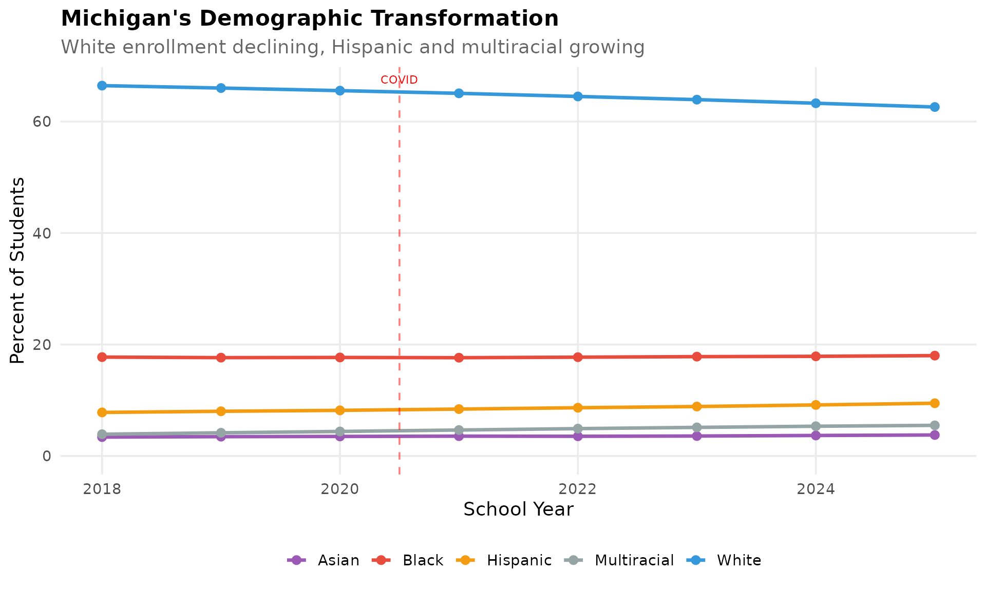 subtitle = "White enrollment declining, Hispanic and multiracial growing",