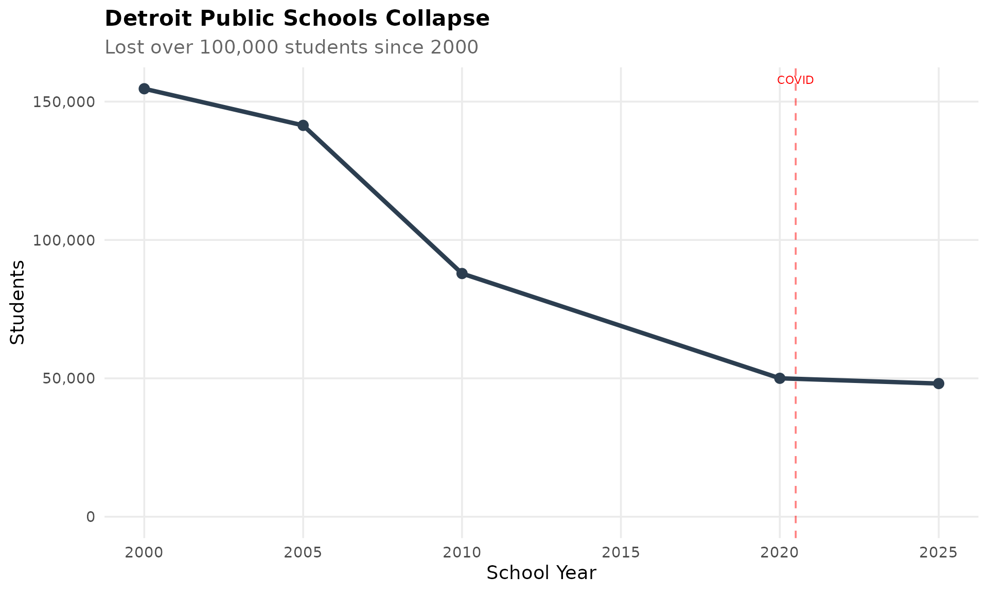 Detroit Public Schools has lost over 100,000 students since 2000. The district went from 154,648 students in 2000 (as Detroit City School District) to 48,117 in 2025 (as Detroit Public Schools Community District after a 2016 restructuring). This represents one of the most dramatic urban enrollment declines in American education history.