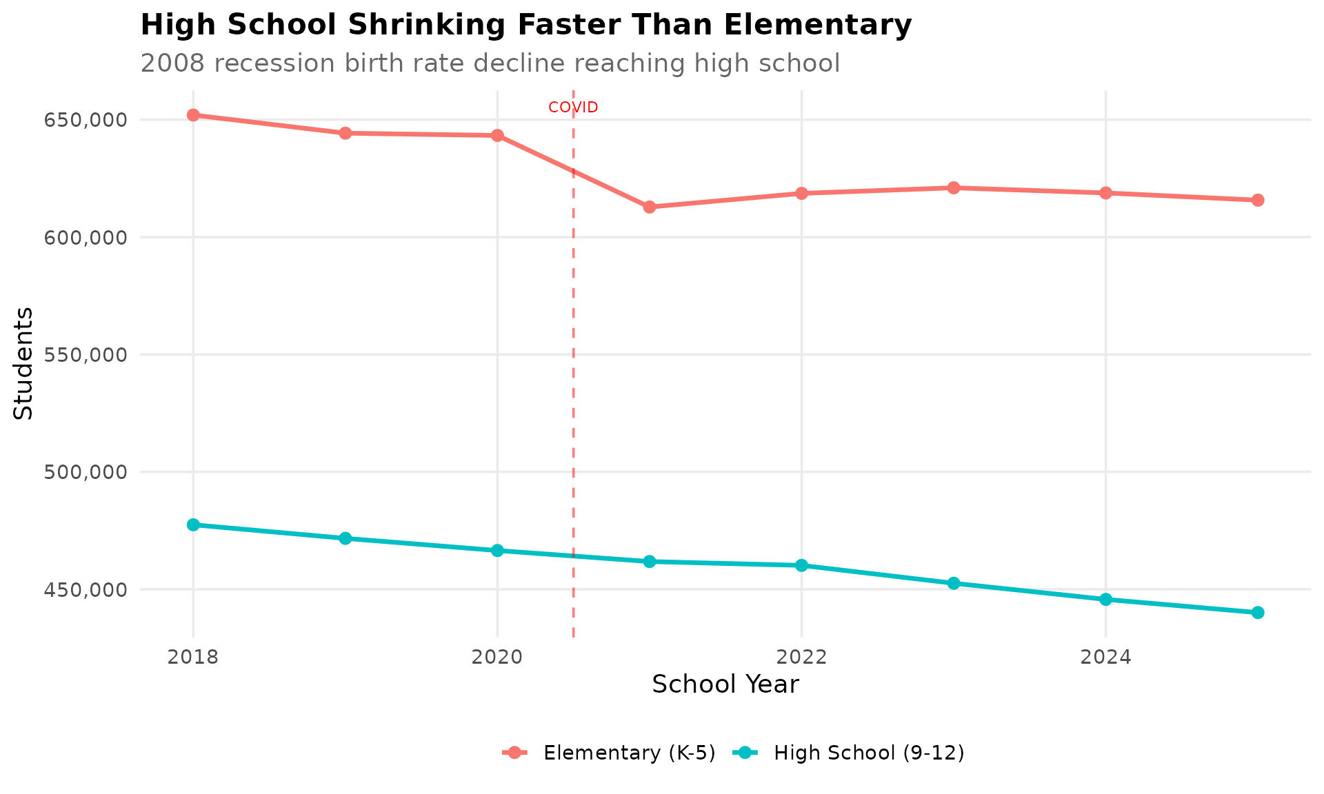 labs(title = "High School Shrinking Faster Than Elementary",