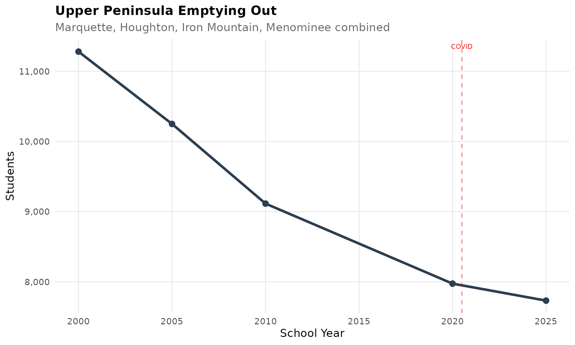 UP districts have lost over 30% of students since 2000 as the region’s population ages and young families move south. Combined enrollment in Marquette, Houghton, Iron Mountain, and Menominee area districts dropped from 11,280 to 7,733.