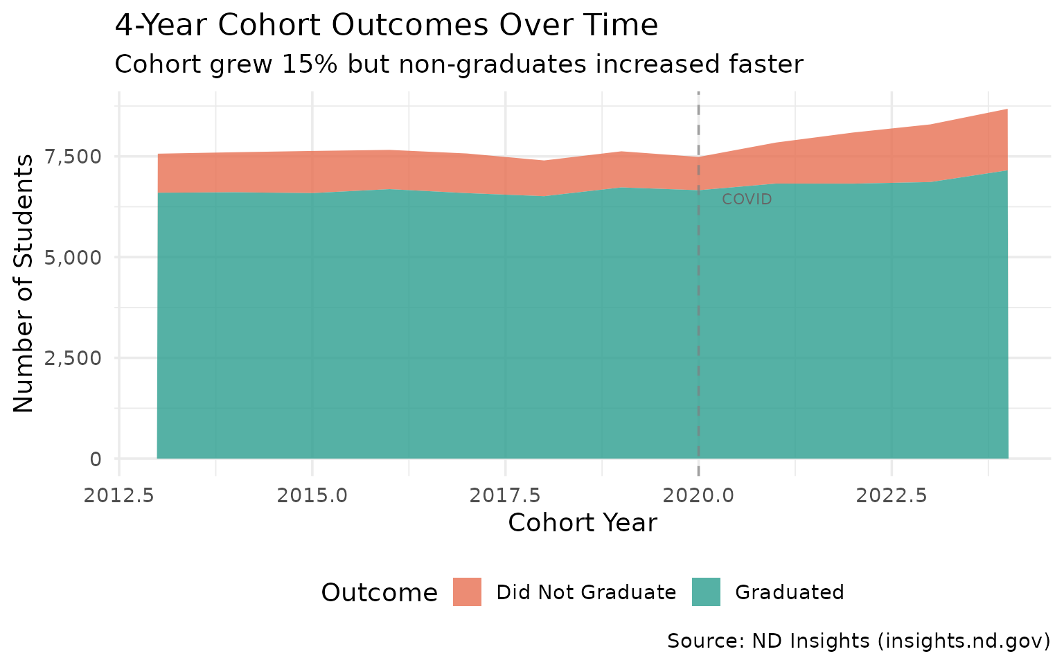 subtitle = "Cohort grew 15% but non-graduates increased faster",