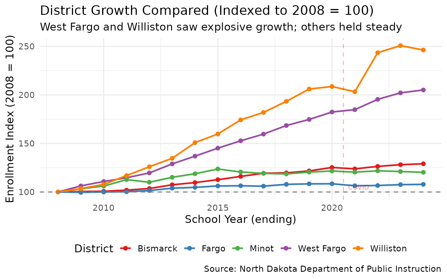 filter(district_name %in% c("Fargo", "West Fargo", "Bismarck", "Williston", "Minot"))