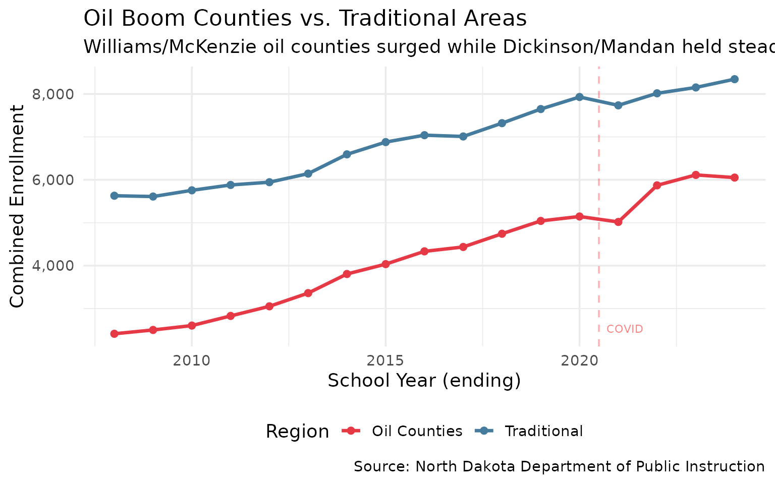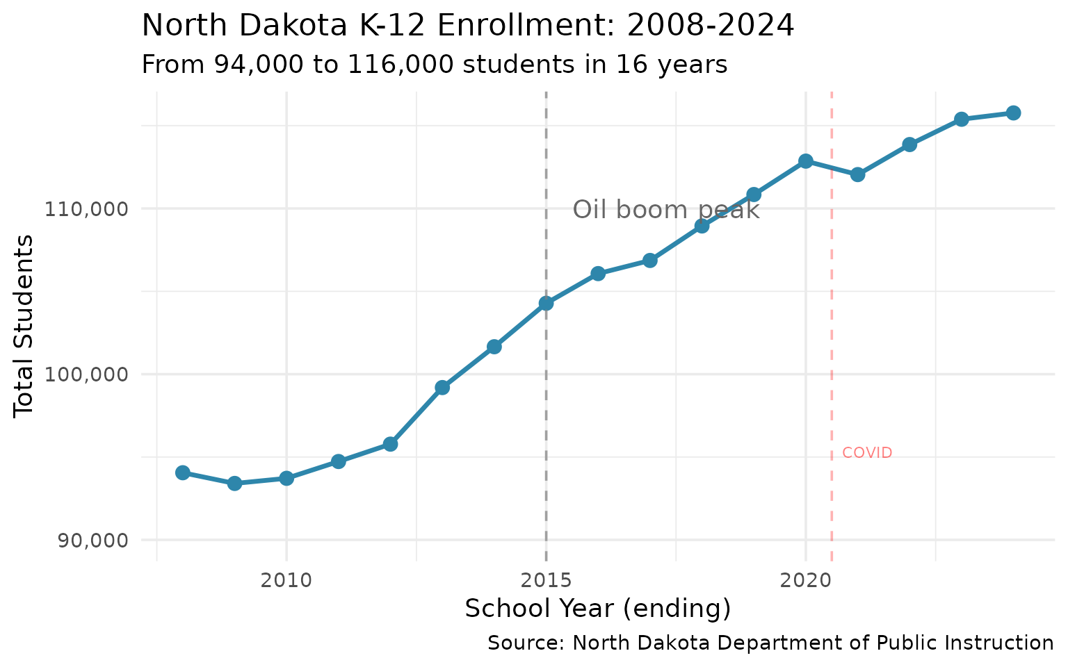 theme_set(theme_minimal(base_size = 14))North Dakota’s school enrollment tells a story of oil booms, suburban growth, and rural consolidation. This vignette visualizes the key insights from the ndschooldata package.