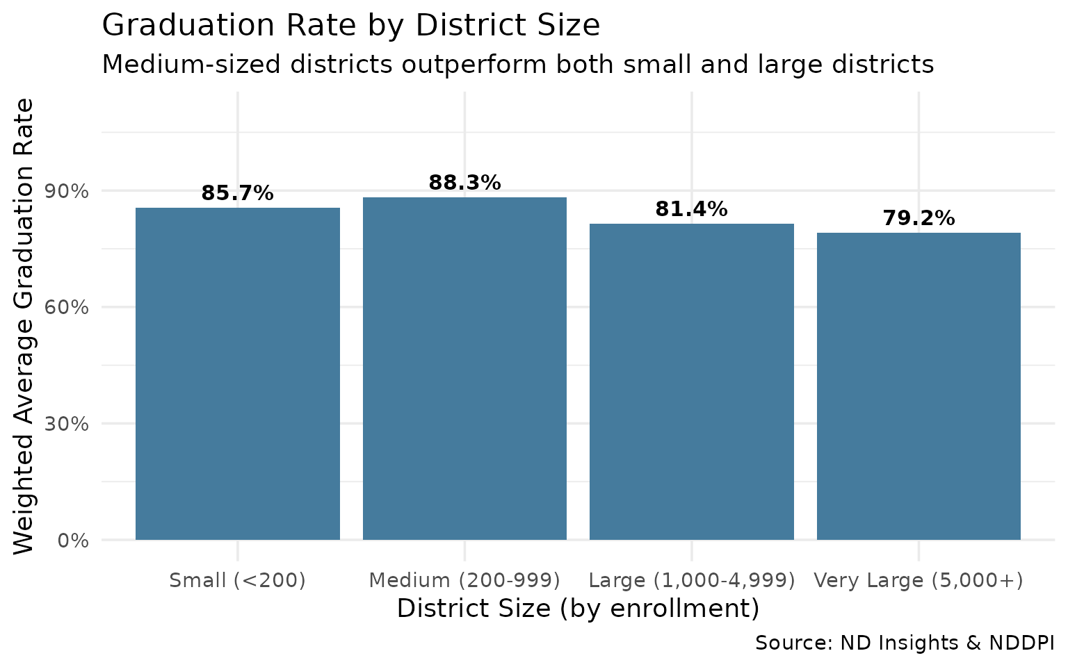 Mid-size districts (200-999 students) outperform both small rural and large urban districts.
