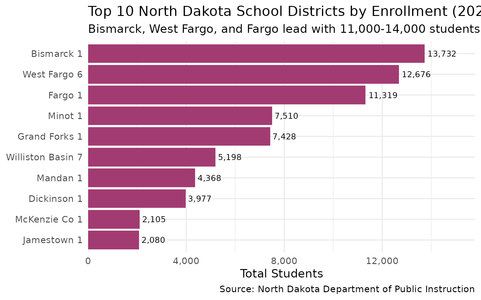 subtitle = "Bismarck, West Fargo, and Fargo lead with 11,000-14,000 students each",