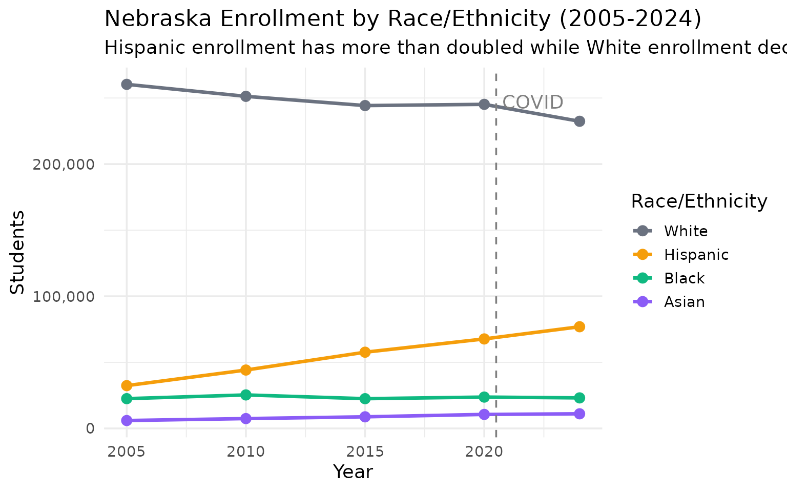 title = "Nebraska Enrollment by Race/Ethnicity (2005-2024)",