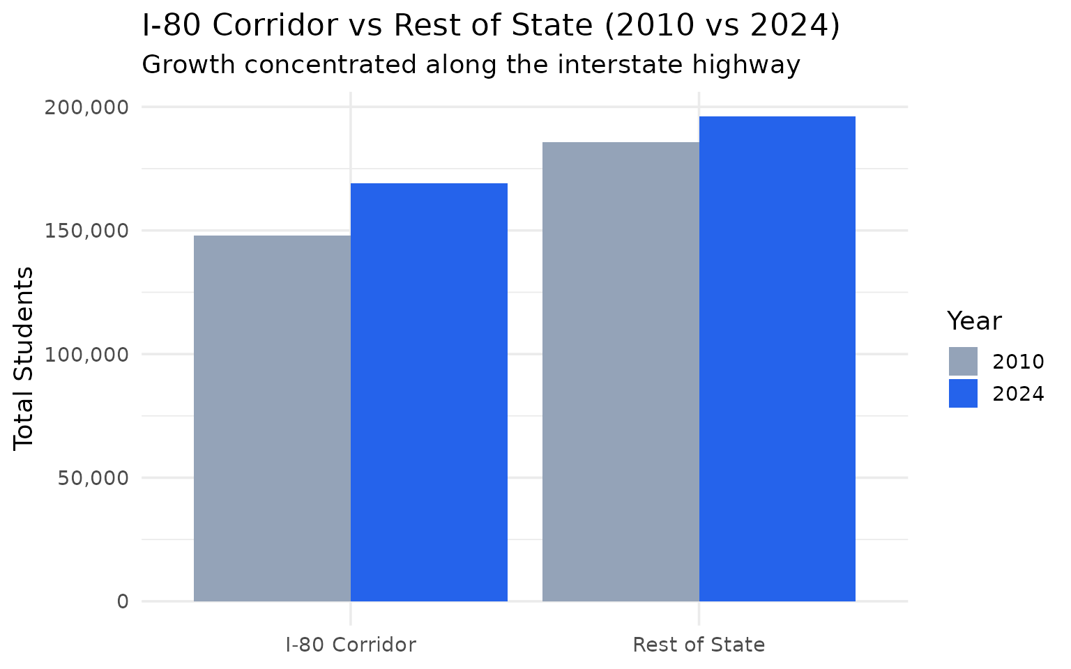 The I-80 corridor gained 21,000 students while the rest of the state grew too