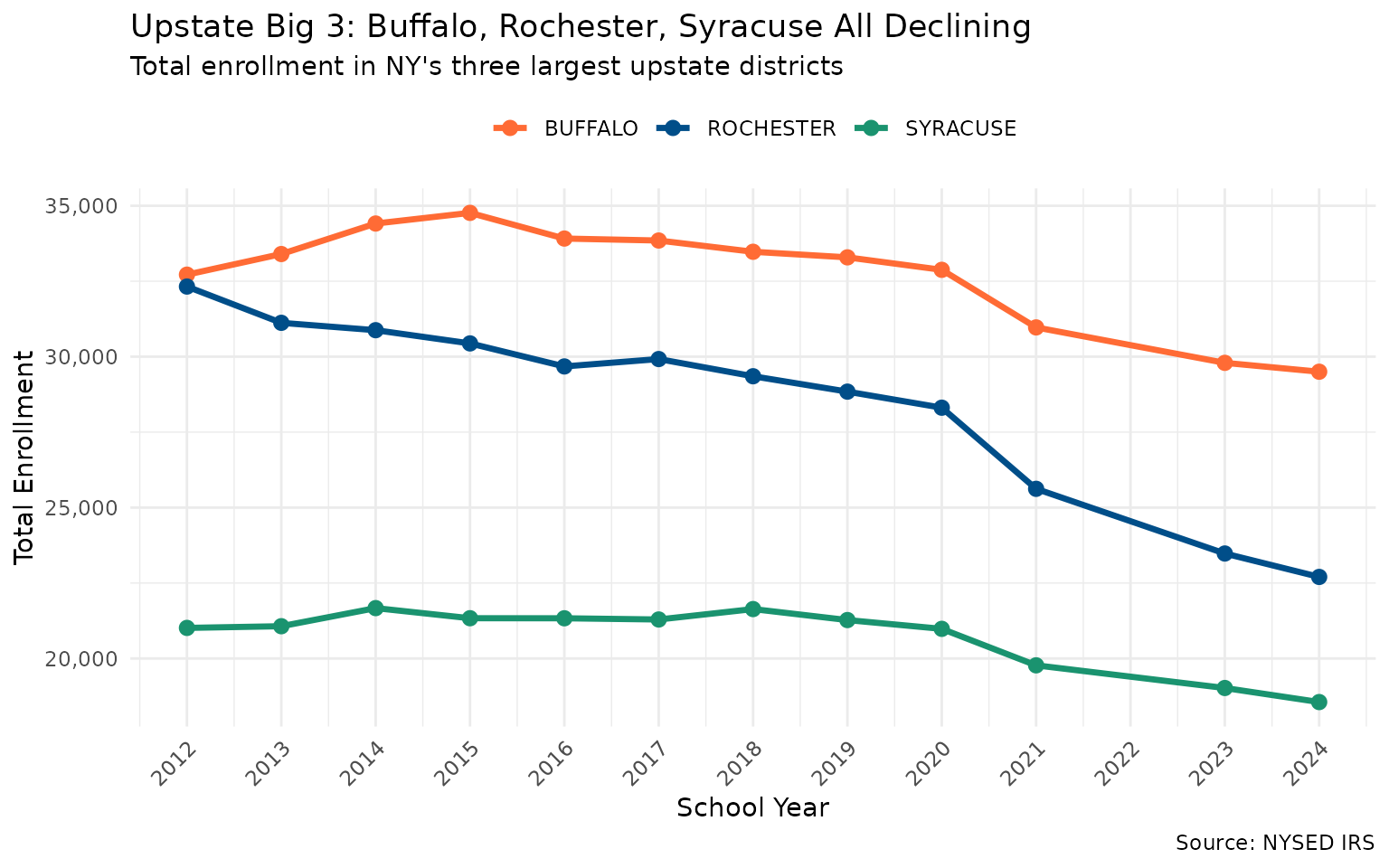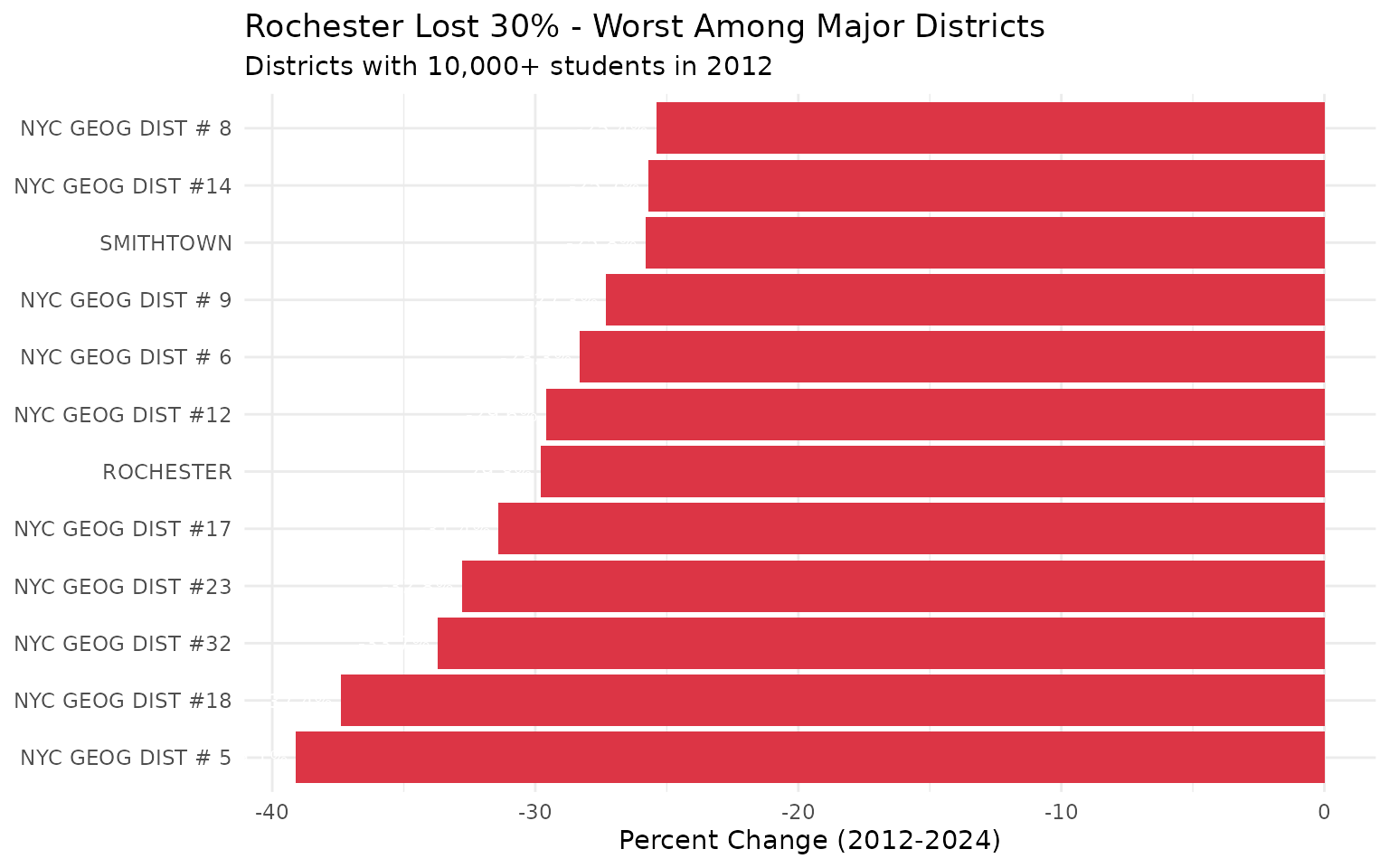 Geographic divergence: NYC lost students faster than the rest of the state (-12.1% vs -10.2%), Long Island lost 35,000 despite stable housing, and even upstate’s largest cities lost 10-30% each.