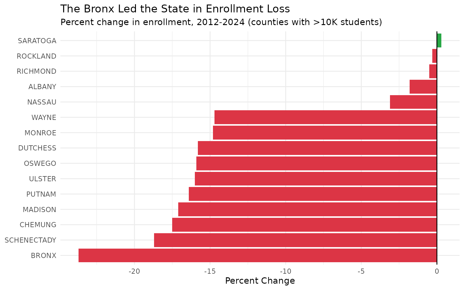 The Bronx lost 23.7% of its students - the worst percentage decline among major counties, losing nearly 50,000 students.