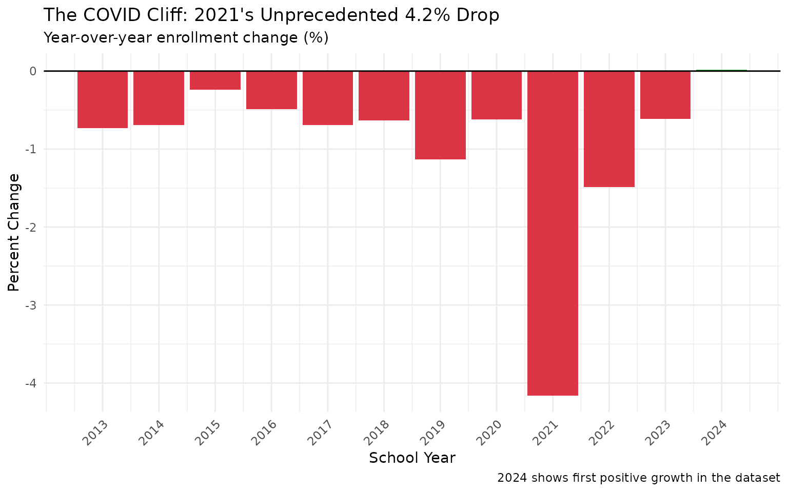 enr <- fetch_enr_years(2012:2024, level = "district", tidy = TRUE, use_cache = TRUE)1. The Vanishing 300,000