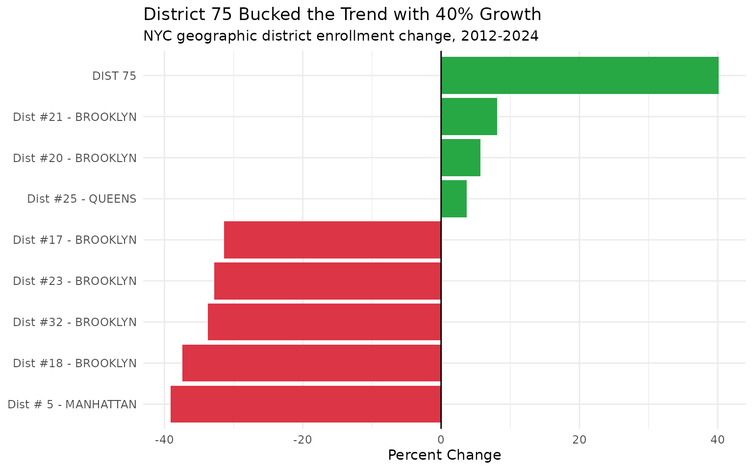 | District 75 special ed (+40%) | The Bronx (-24%) |