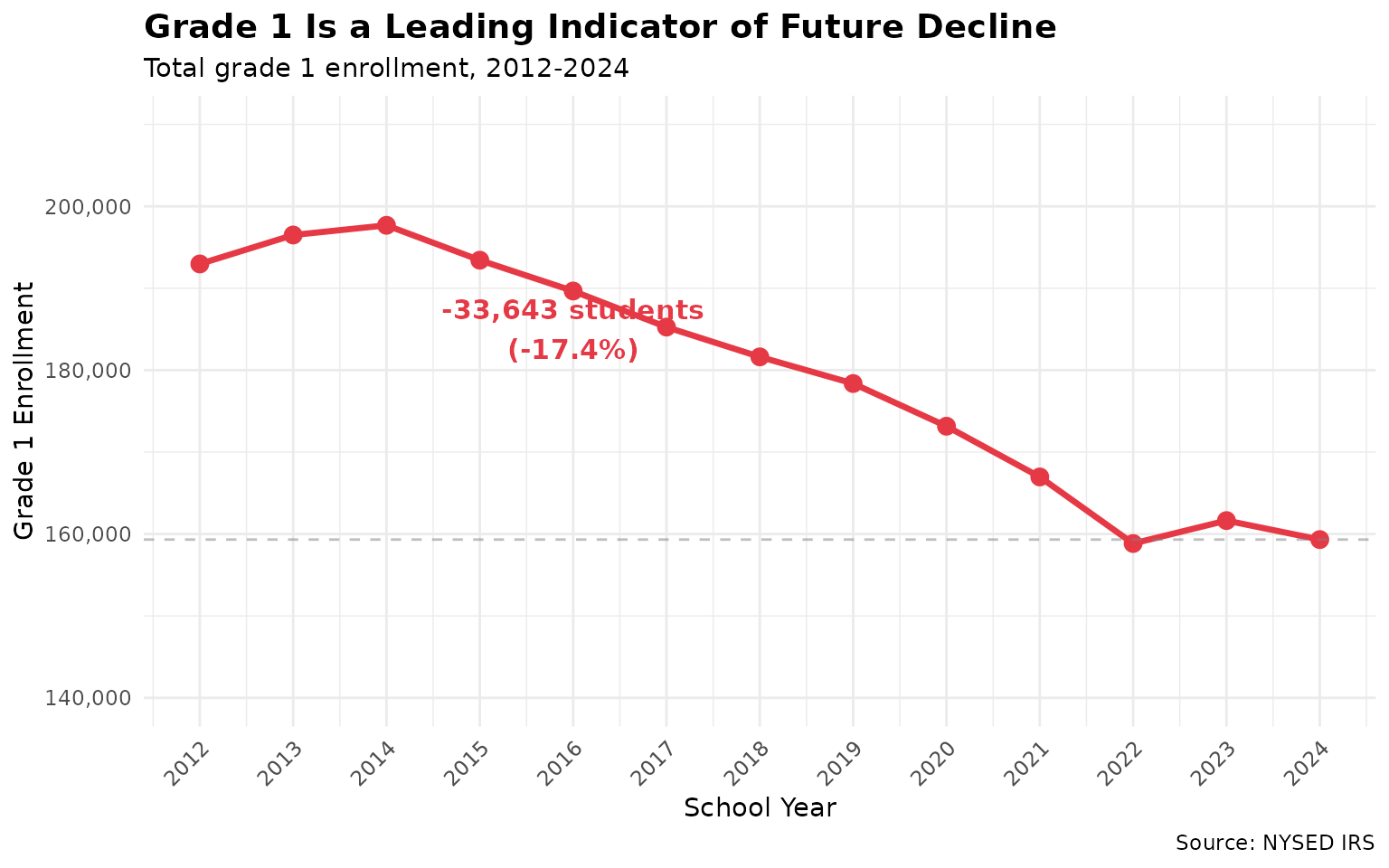 Demographic decline: New York’s birth rate has fallen sharply, especially in urban areas. The pipeline of future students is shrinking - Grade 1’s 17% decline is a leading indicator.