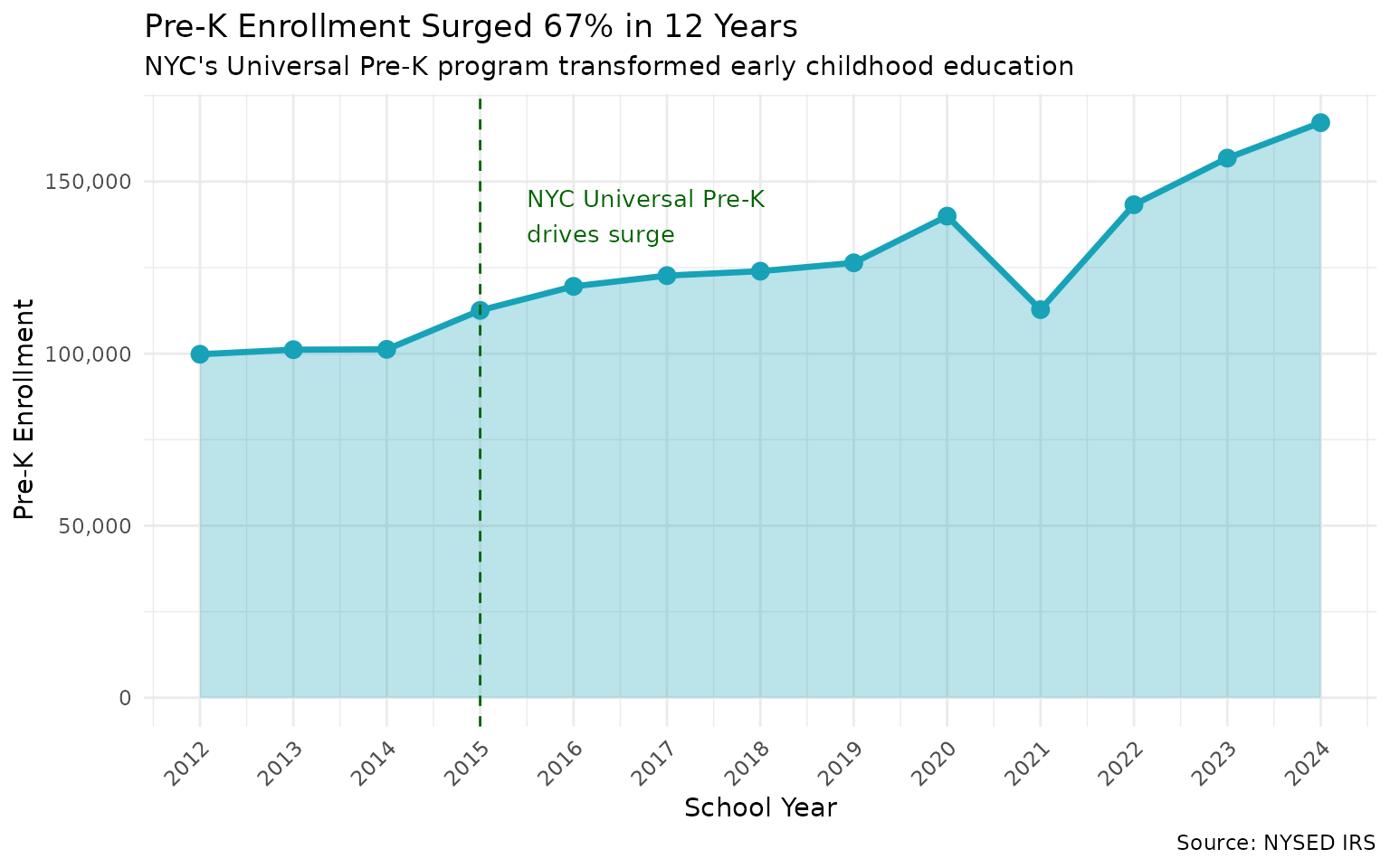 Policy success: Universal Pre-K transformed early childhood education in NYC. The 67% growth in Pre-K enrollment, driven primarily by full-day expansion, is one of the most dramatic policy-driven enrollment shifts in state history.