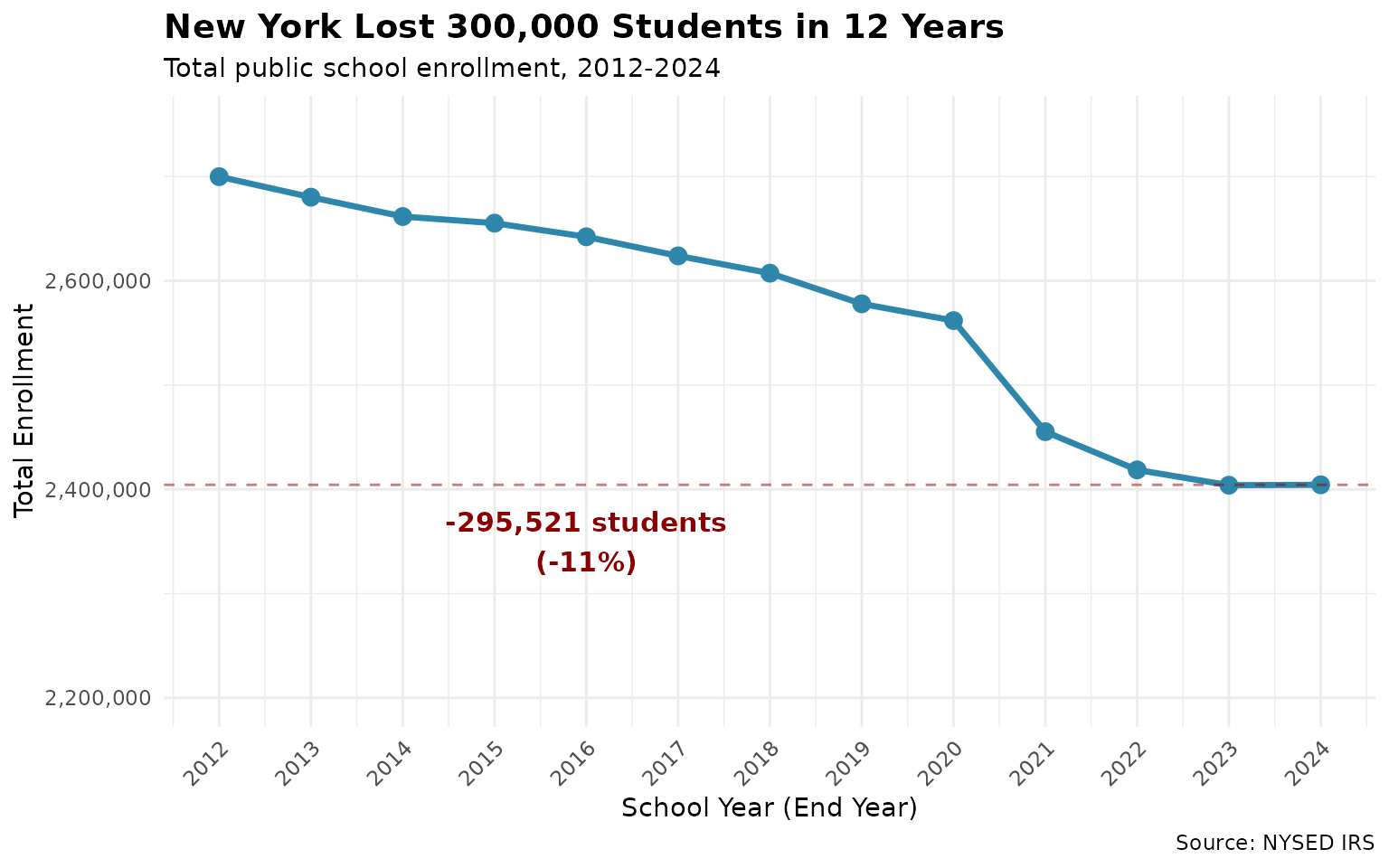 New York lost 295,521 students (11%) from 2012 to 2024 - equivalent to losing every student in Buffalo, Rochester, Syracuse, and Yonkers combined.
