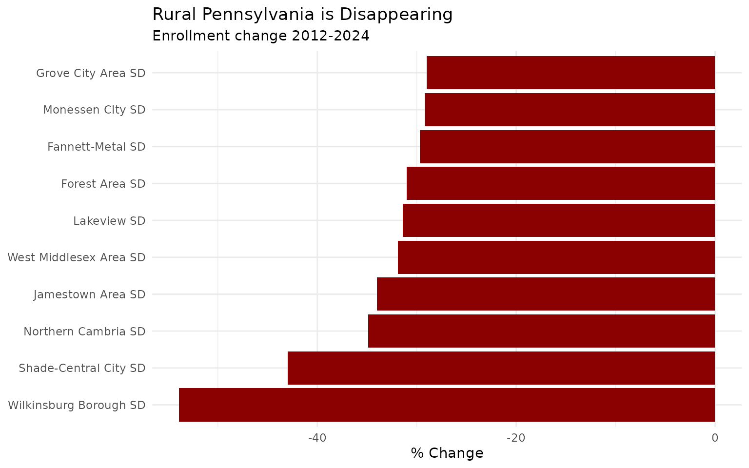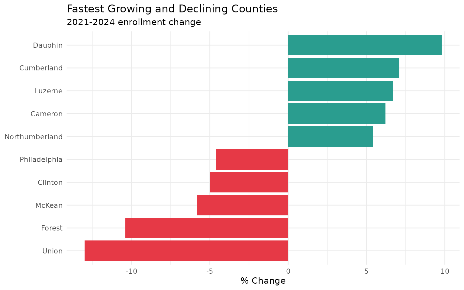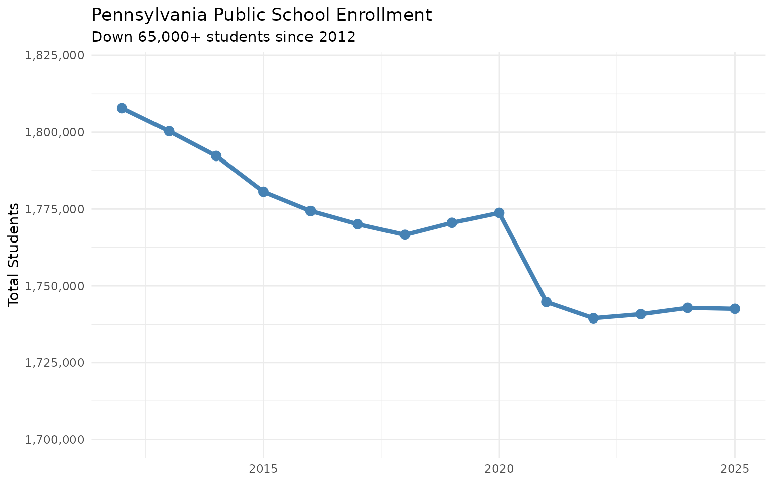 This vignette explores enrollment trends in Pennsylvania schools using data from the Pennsylvania Department of Education.