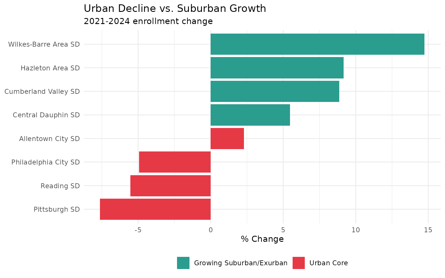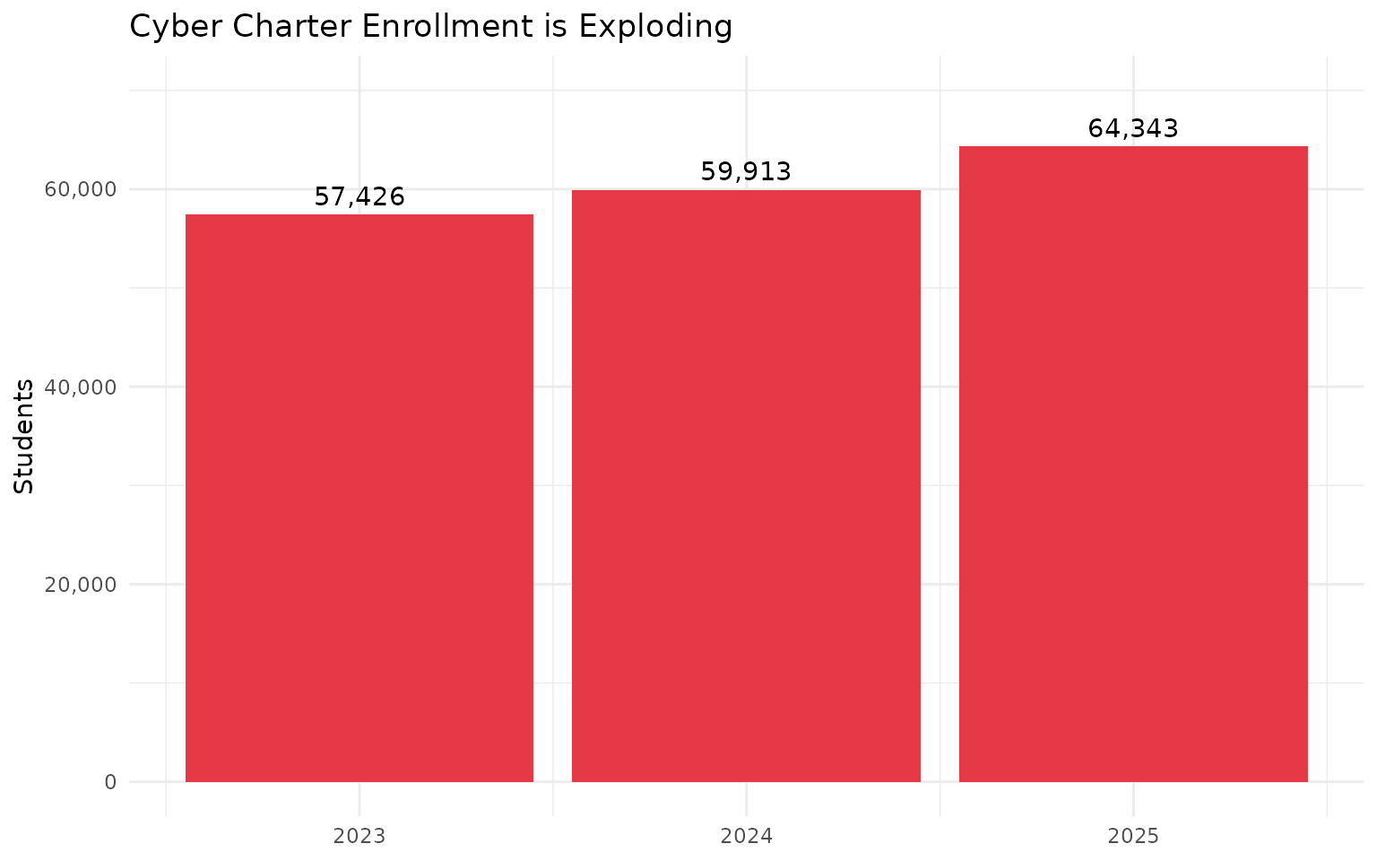 #> 5 Reading SD SD 16680Commonwealth Charter Academy, a cyber charter based in Harrisburg, enrolled 23,595 students in 2024. That’s larger than Pittsburgh, Central Bucks, and Reading. A single cyber charter is now bigger than 99% of traditional school districts.