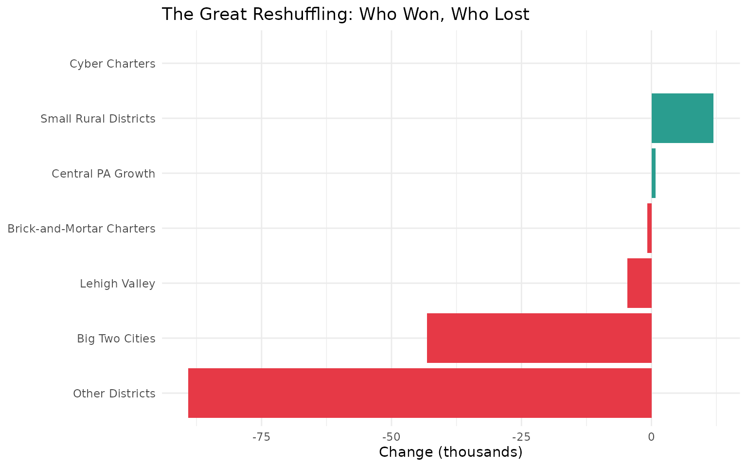 From 2012 to 2024, Pennsylvania lost 65,000 public school students. But the story isn’t uniform decline - it’s a massive reshuffling. Cyber charters and Central PA suburbs gained while the Big Two cities, small rural districts, and other categories lost. The chart above shows the winners and losers.